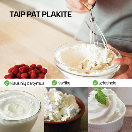 Naudodami pridedamą priedą taip pat galite lengvai plakti trynius, kiaušinių baltymus ar įvairius kremus. Paprasčiausiai naudokite viršutinę trintuvo dalį ir pridėkite prie jos plaktuvą plakimui.