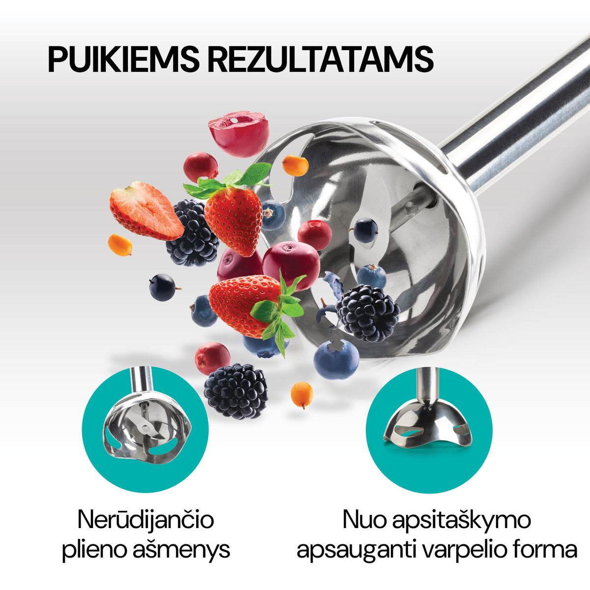 - Rinkinyje yra įvairių priedų, kad būtų dar lengviau maišyti, plakti ar smulkinti.