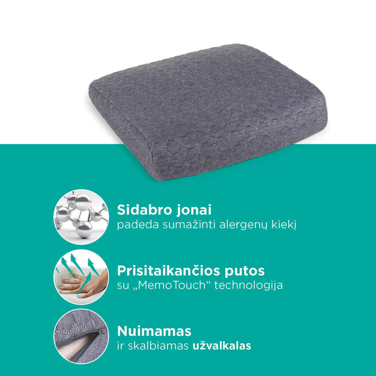 MemoSilver VitaSpine sėdynės pagalvė užtikrina komfortą ilgesnių sėdėjimo periodų metu ant bet kokio paviršiaus. Jos ergonomiška forma palaiko tinkamą klubų, stuburgalio ir apatinės nugaros dalies išlygiavimą, mažindama spaudimo taškus ir gerindama bendrą laikyseną sėdint. Pagaminta iš MemoTouch atminties putų, pagalvė prisitaiko prie kūno formos, suteikdama maksimalų komfortą sėdint prie stalo, vairuojant ar žiūrint televizorių ant sofos. Nuimamas užvalkalas praturtintas sidabro jonais, kurie padeda išvengti bakterijų dauginimosi, alergenų kaupimosi ir odos dirginimo.