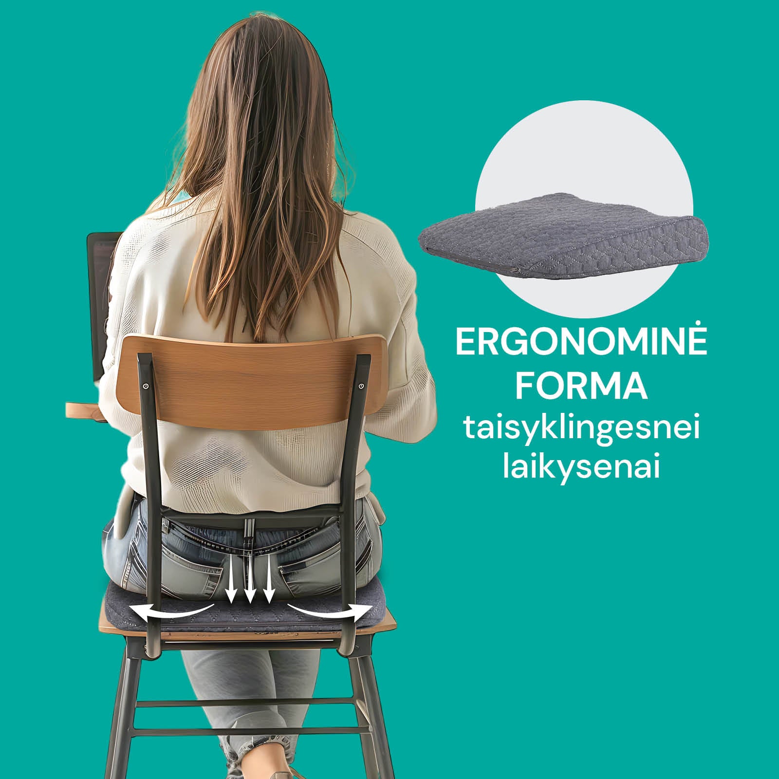 - Ergonomiška pagalvės forma sumažina diskomfortą ir spaudimą klubams bei uodegikauliui.