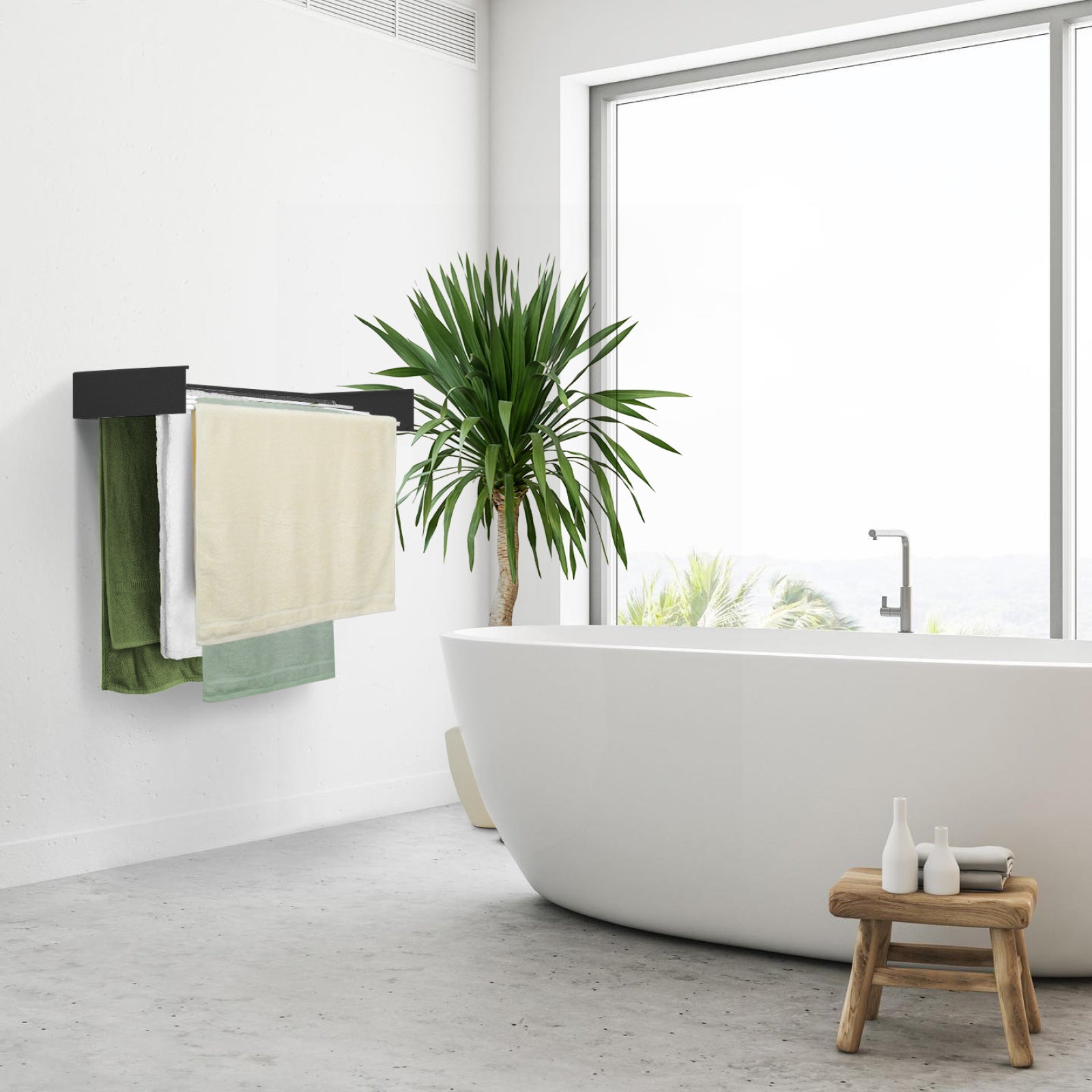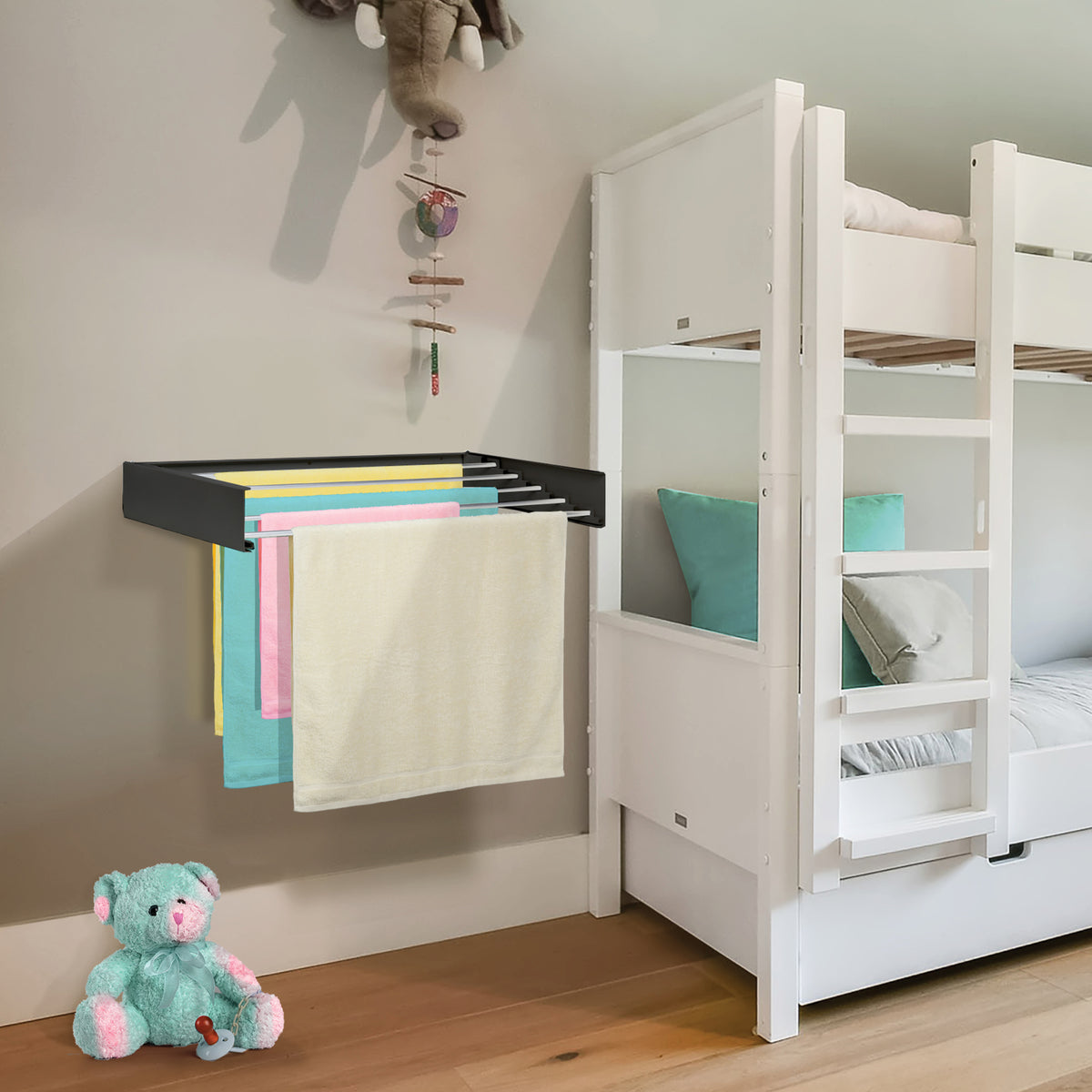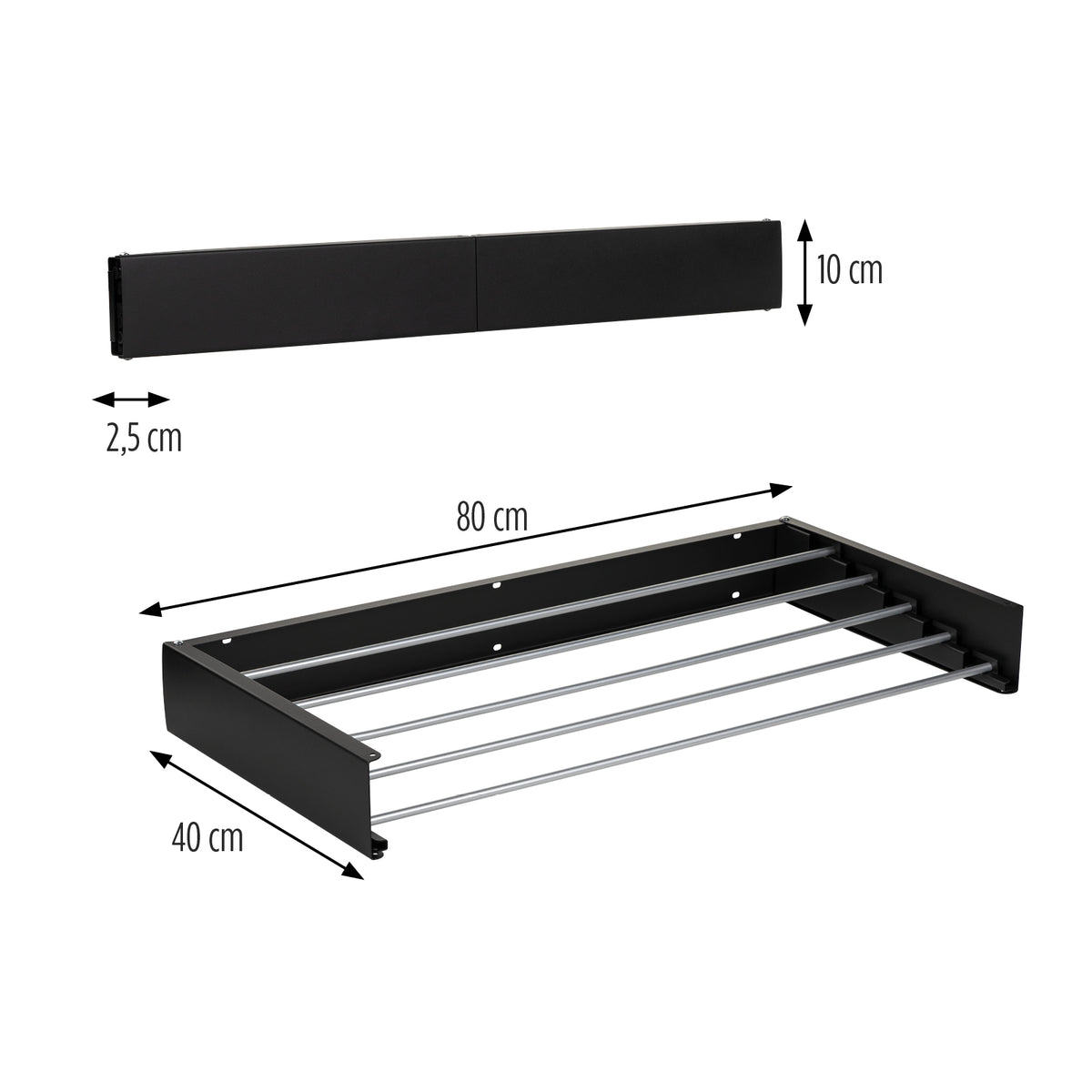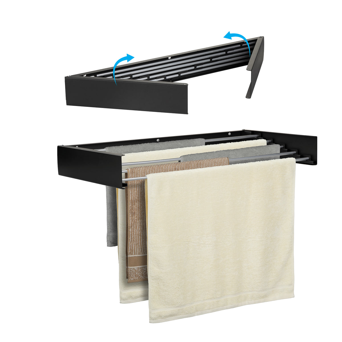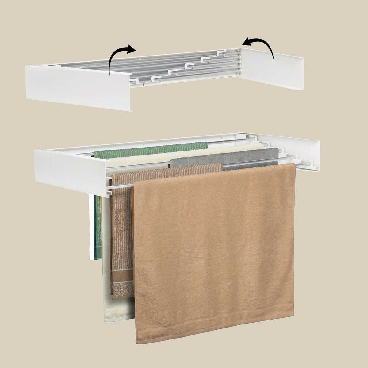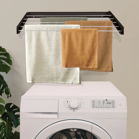 Ar jus trikdo sulankstomas dizainas? Nesijaudinkite, šis prie sienos montuojamas džiovinimo stovas atsidaro ir užsidaro vos per kelias sekundes. Kai norite ant jo pakabinti skalbinius, tiesiog atidarykite jį ir ištraukite džiovinimo strypus. Kai skalbiniai išdžiūsta, tiesiog įstumkite džiovinimo strypus ir uždarykite lentyną. Itin praktiška ir paprasta.