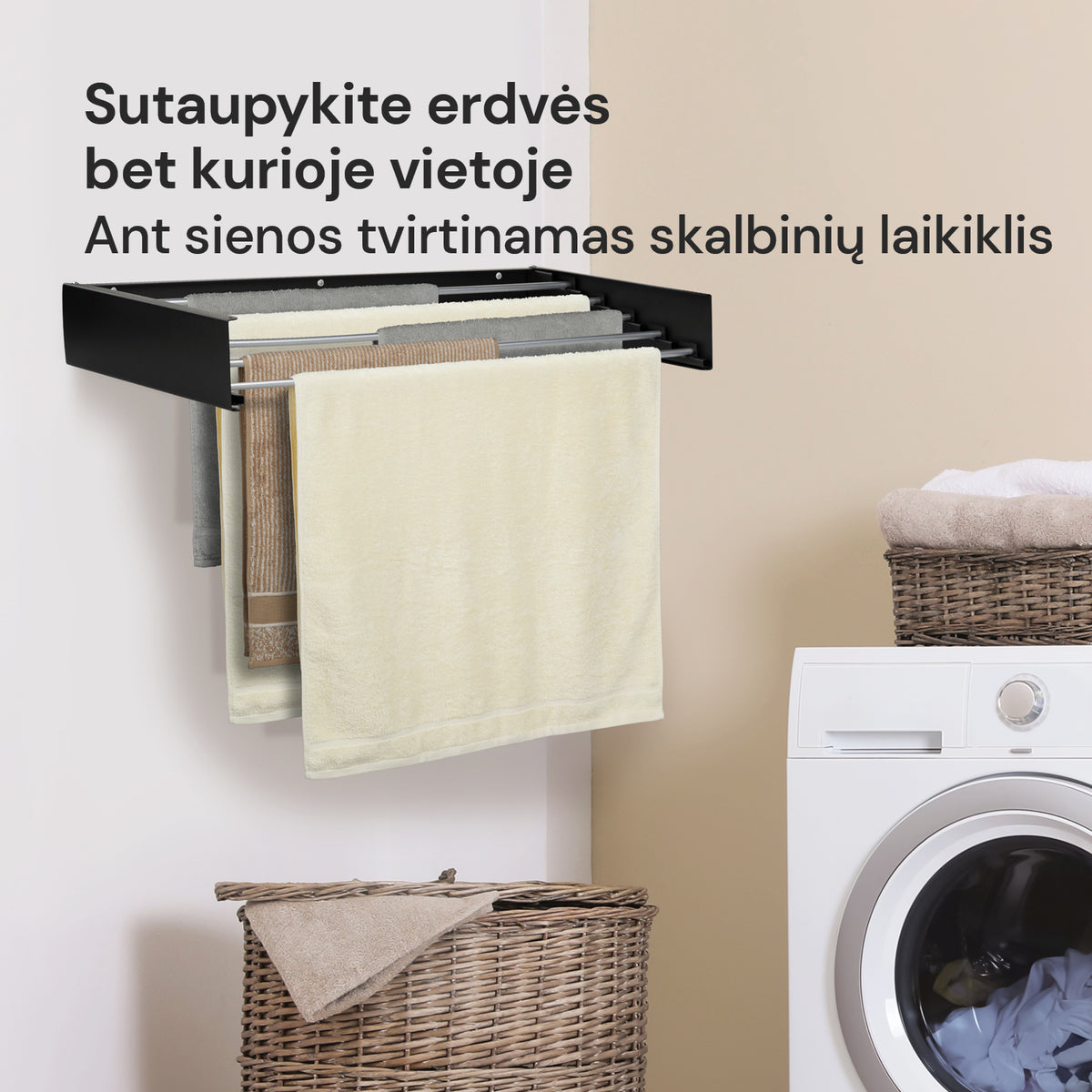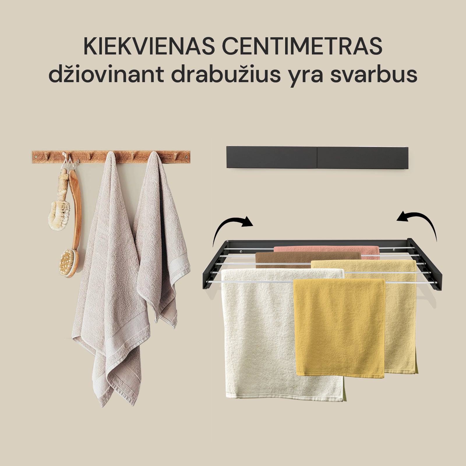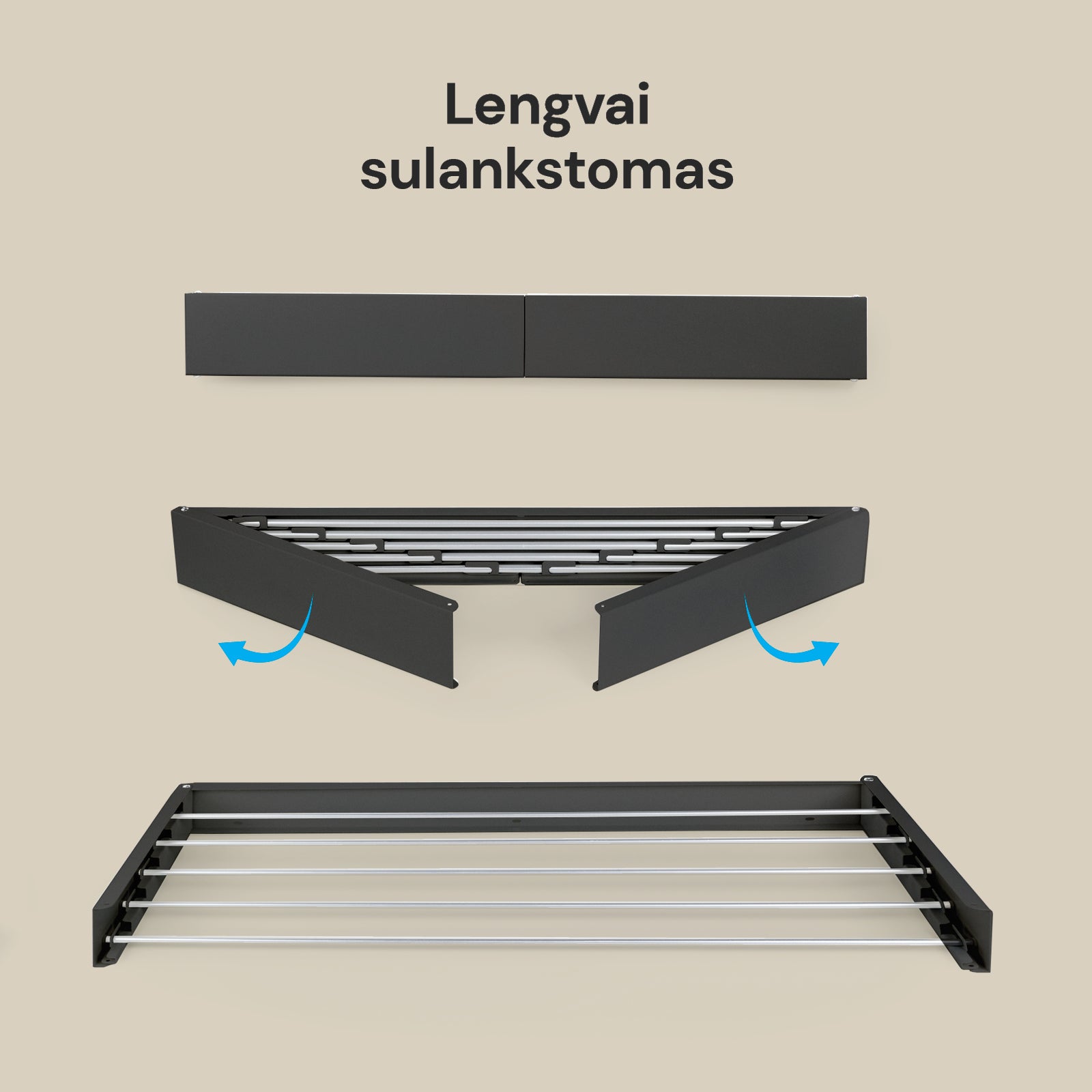 Sulankstomas dizainas, kad būtų maksimaliai išnaudota erdvė džiovinant drabužius.