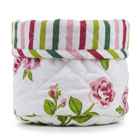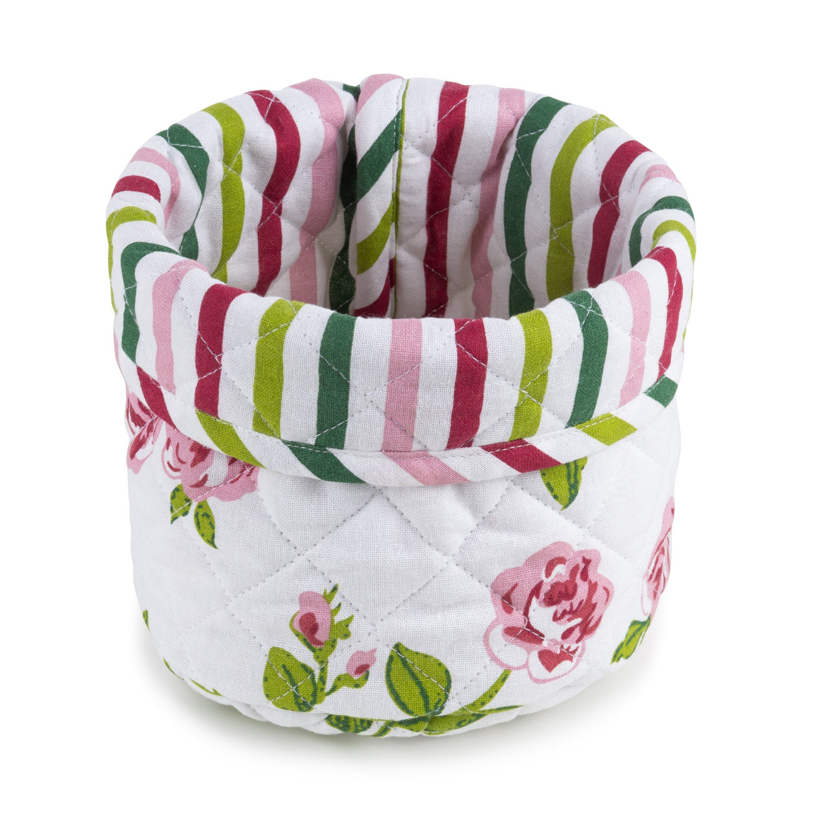 Apvalus krepšelis pagamintas iš medvilninio audinio ir aukštos kokybės mikropluošto užpildo. Jis skirtas įvairiems daiktams laikyti, taip pat puikiai tinka duonai ar kitiems kepiniams patiekti. Klasikinis rožių ir dryžių raštas patiks visų kartų atstovams. Krepšelį galima skalbti skalbyklėje 40 °C temperatūroje.