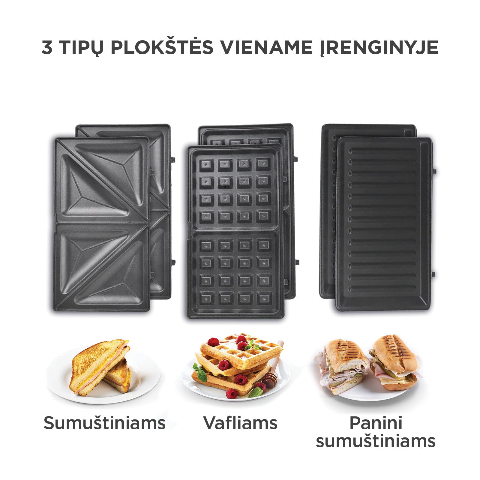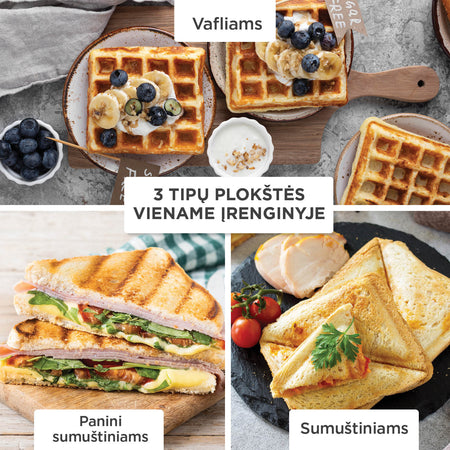 Ruošiate pusryčius svečiams ar reikia greito užkandžio vaikams? Kadangi prietaisas turi 3 skirtingas plokštelių poras, jūs nebesate apriboti vieno patiekalo ruošimu. Tiesiog pakeiskite plokšteles ir paruoškite traškius skrudintus sumuštinius pusryčiams, saldžius vaflius popietės desertui arba gardžius paninius vakarienei. Ant panini plokštelės galite netgi iškepti mėsą, daržoves ar jūros gėrybes – kaip ant grilio. Vienas įrenginys, kuris patenkins visus šeimos skonius ir poreikius..