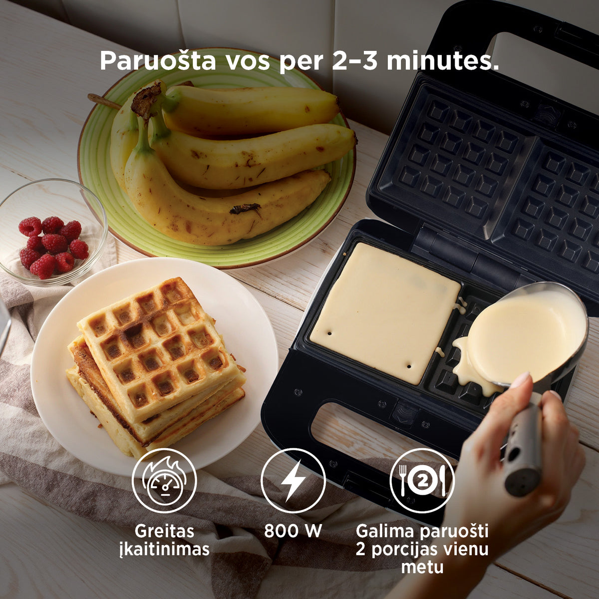 - Galima vienu metu paruošti 2 sumuštinius arba vaflius – patogu visai šeimai.