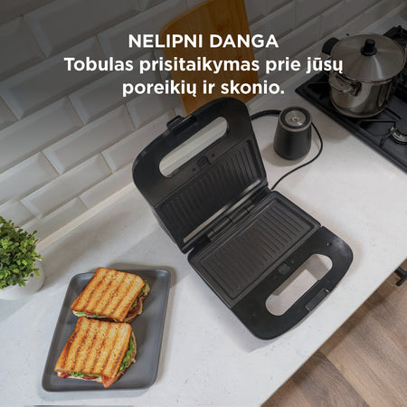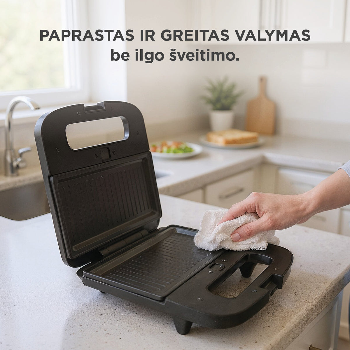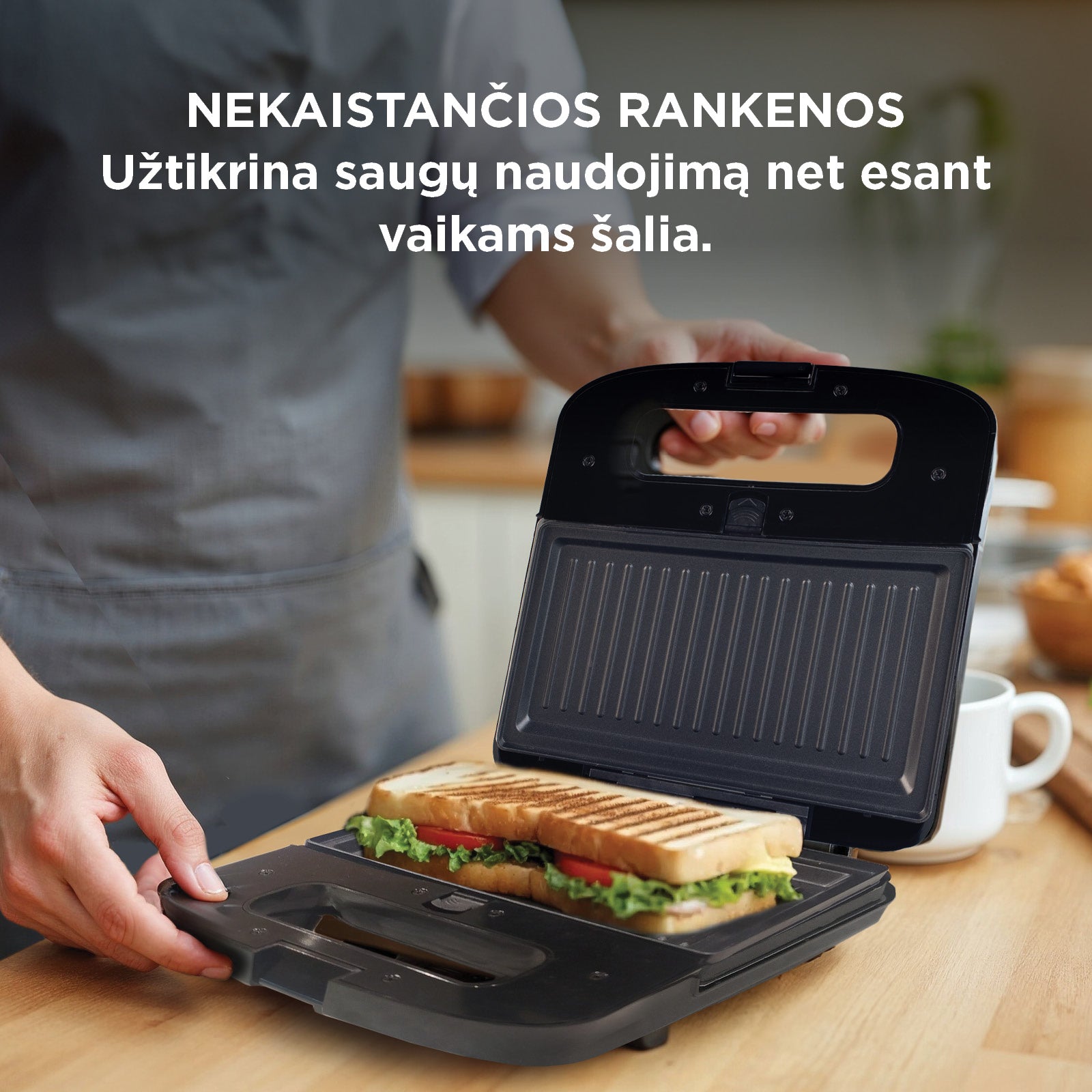 - Įkaista vos per 2–3 minutes – traškiais sumuštiniais, vafliais ar paniniais galėsite mėgautis iš karto.