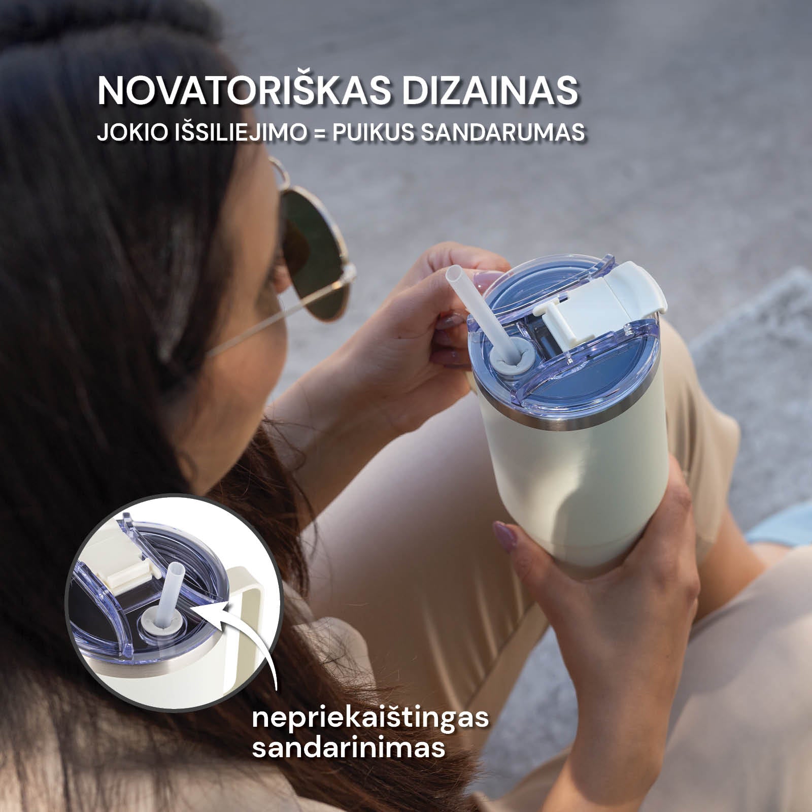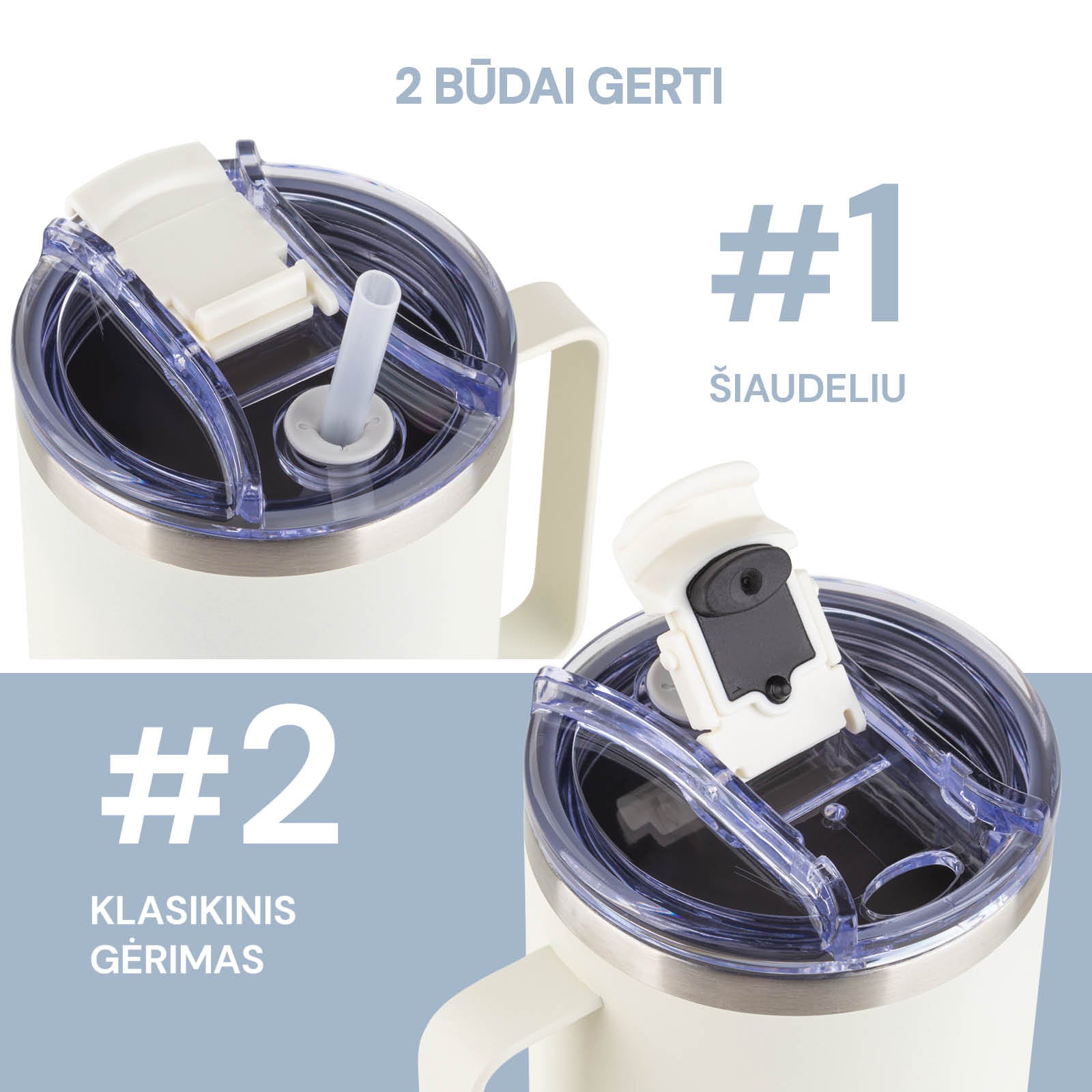 - Su naujovišku dangteliu galite gerti per šiaudelį arba tiesiai iš puodelio.