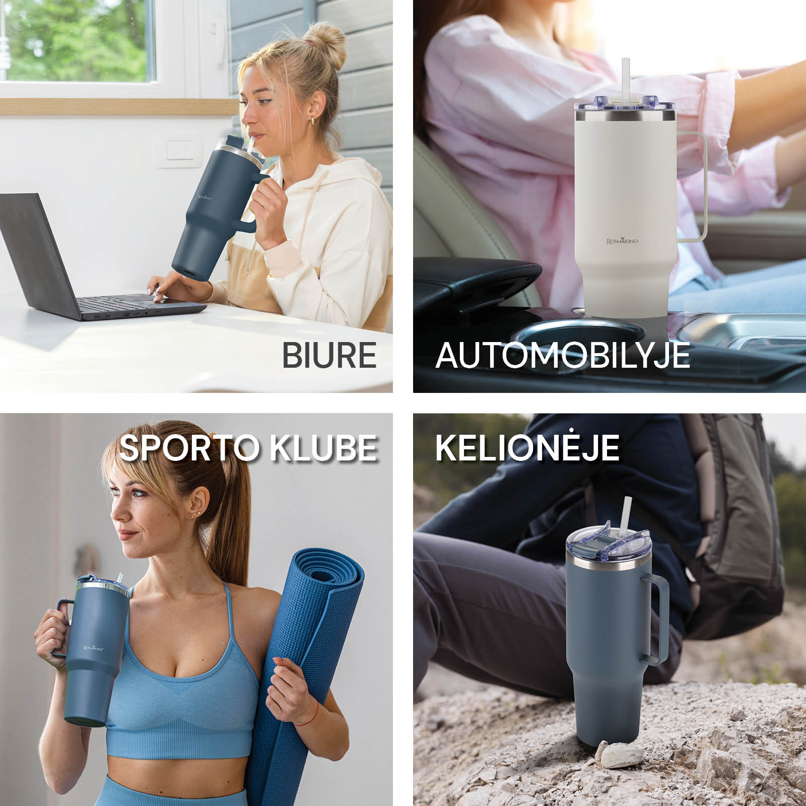 - Didelė talpa, patogus šiaudelis ir praktiška rankena, kad būtų lengva nešiotis.