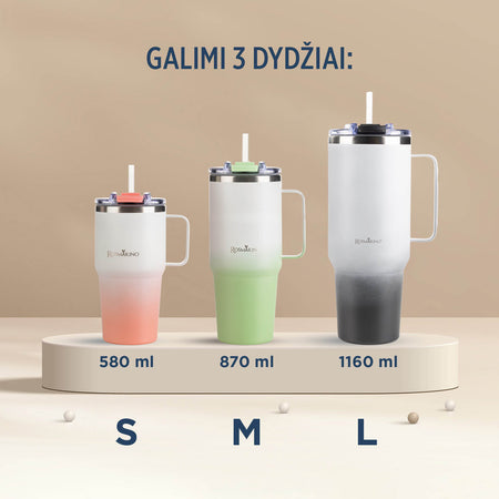 Jūsų gyvenimo būdas unikalus – toks turėtų būti ir jūsų gėrimų puodelis. Rinkitės kompaktišką dydį biurui, vidutinį – kasdieniams nuotykiams, arba didžiausią – ilgoms dienoms, kai būtina gerti daug skysčių. Kiekvienas dydis turi dvigubų sienelių izoliaciją iš nerūdijančio plieno, tačiau gėrimai neįgauna metalo skonio. Nesvarbu, ar geriate daržovių kokteilius, šaltą kavą ar tiesiog švarų, gaivų vandenį – kiekvienas gurkšnis bus toks, koks ir turi būti. Grynas malonumas.