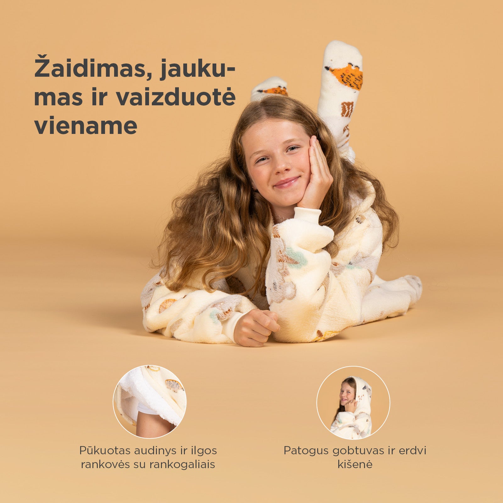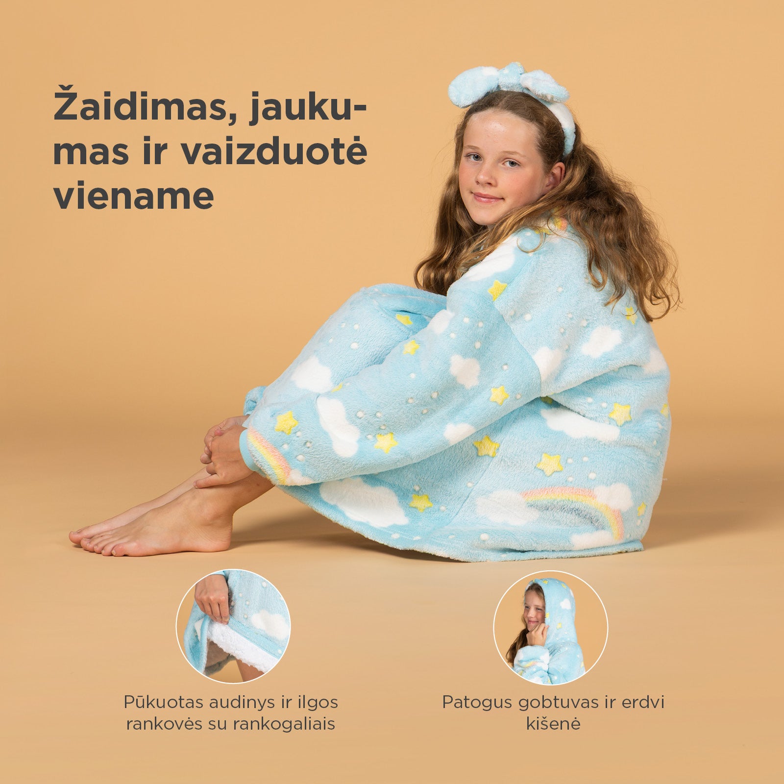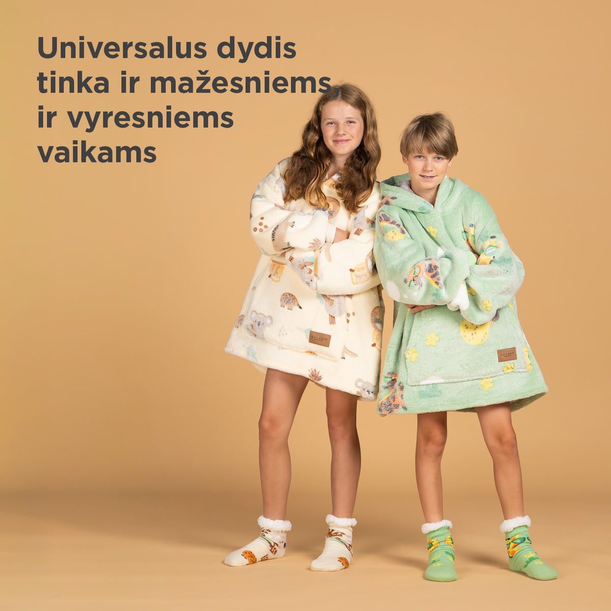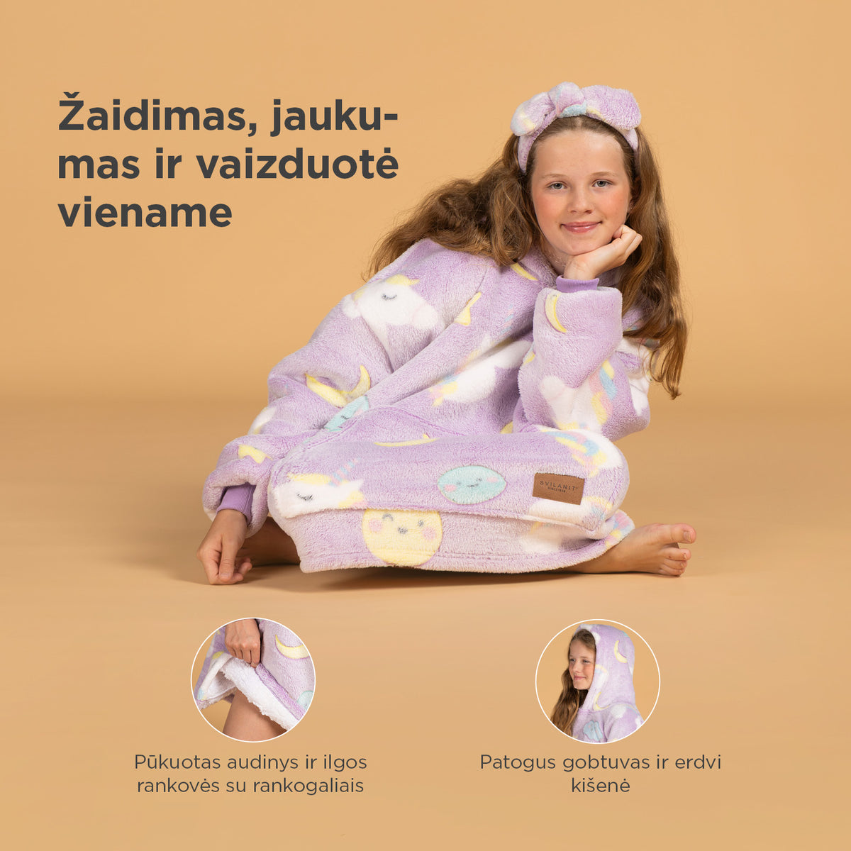 - Vaikai jaučiasi tarsi vilkėtų stebuklingą apsiaustą, kai apsivelka pūkuotą antklodę su gobtuvu.