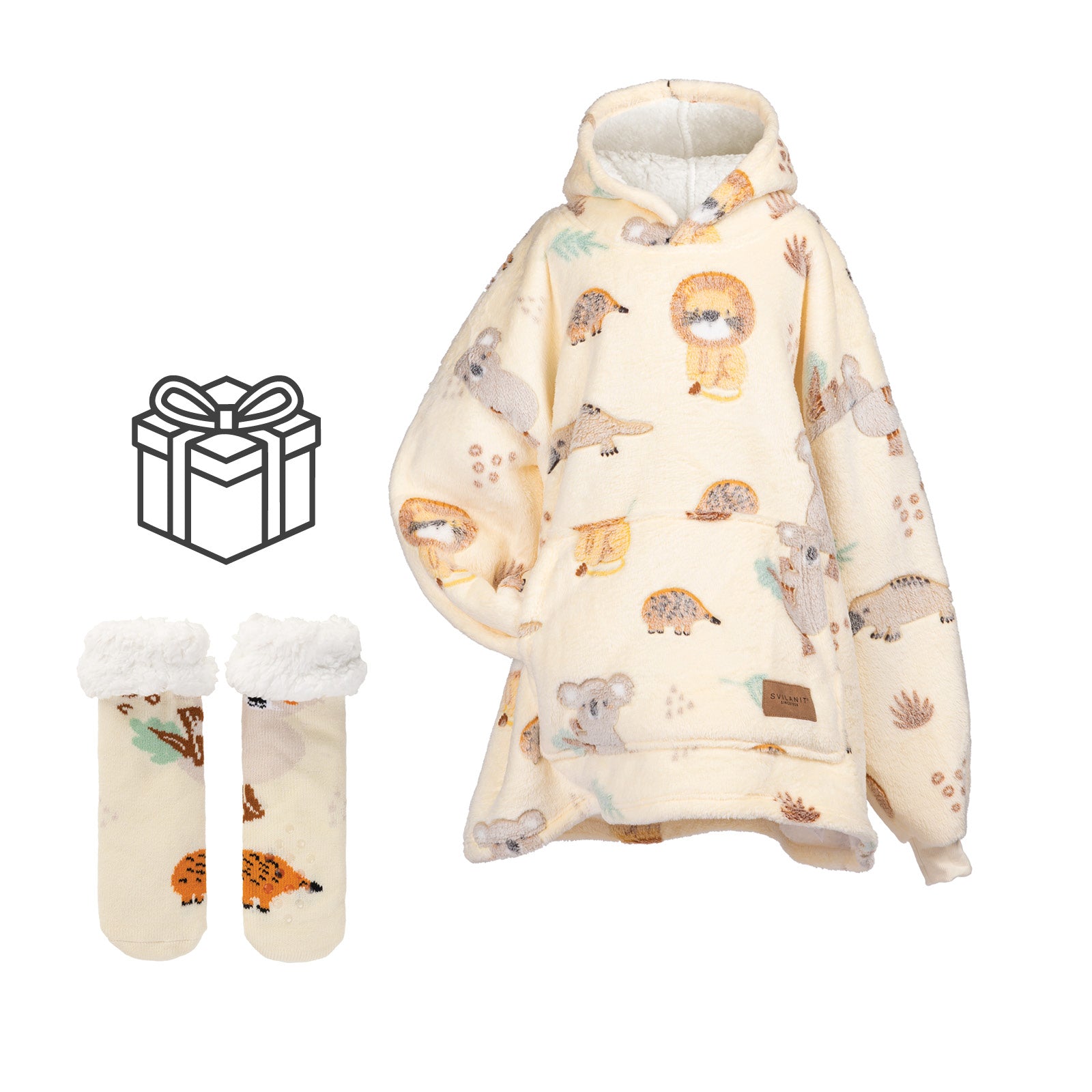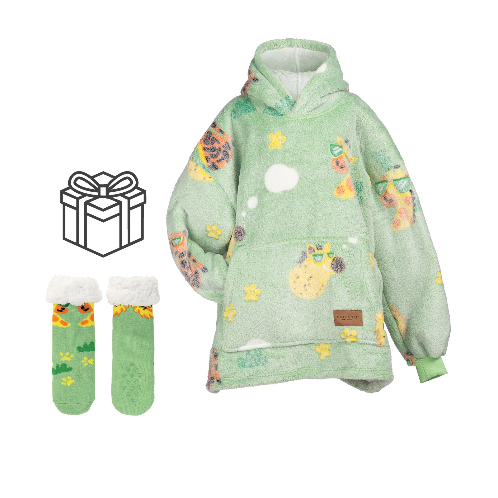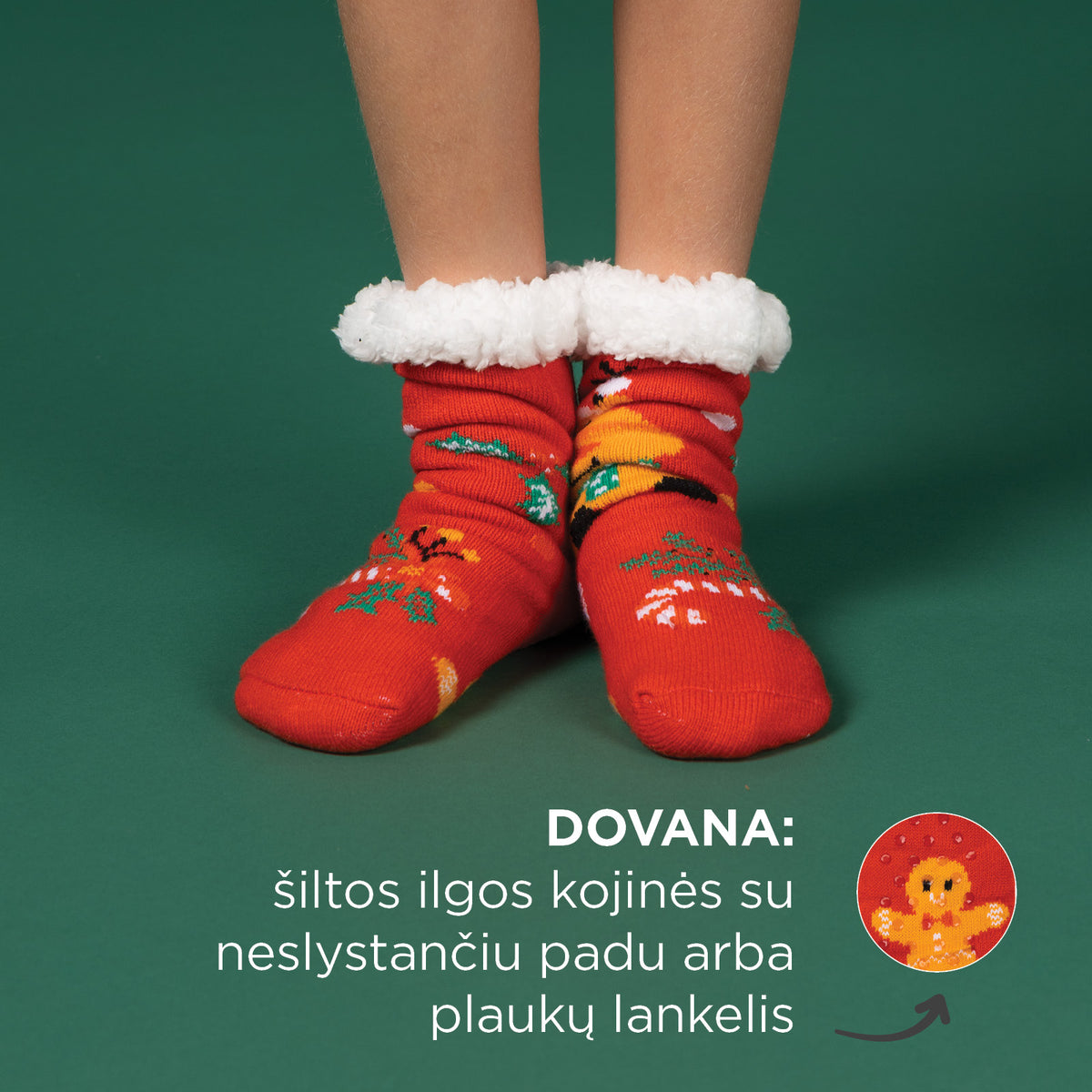 Kiekviena antklodė su gobtuvu turi dovaną, kuri dar labiau pradžiugins vaikus. Šiltos termo kojinės su neslystančiu padu leidžia vaikams saugiai lakstyti po namus, o pėdos išlieka maloniai šiltos. Mergaičių modeliuose vietoje kojinių pridedama plaukų juosta tokiu pačiu raštu kaip ir antklodė su gobtuvu – tobulam stiliaus suderinimui. Praktinė detalė, suteikianti tėvams ramybės, o vaikams – džiaugsmo.