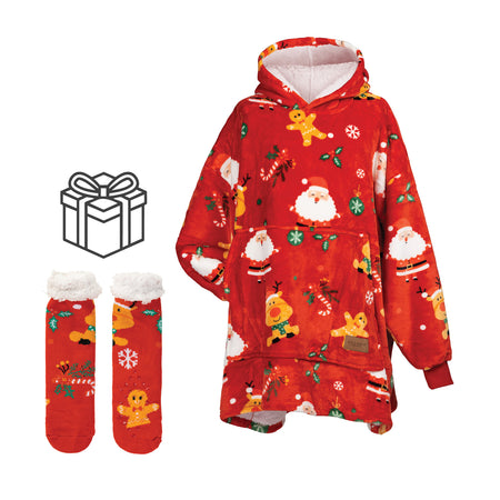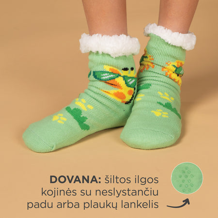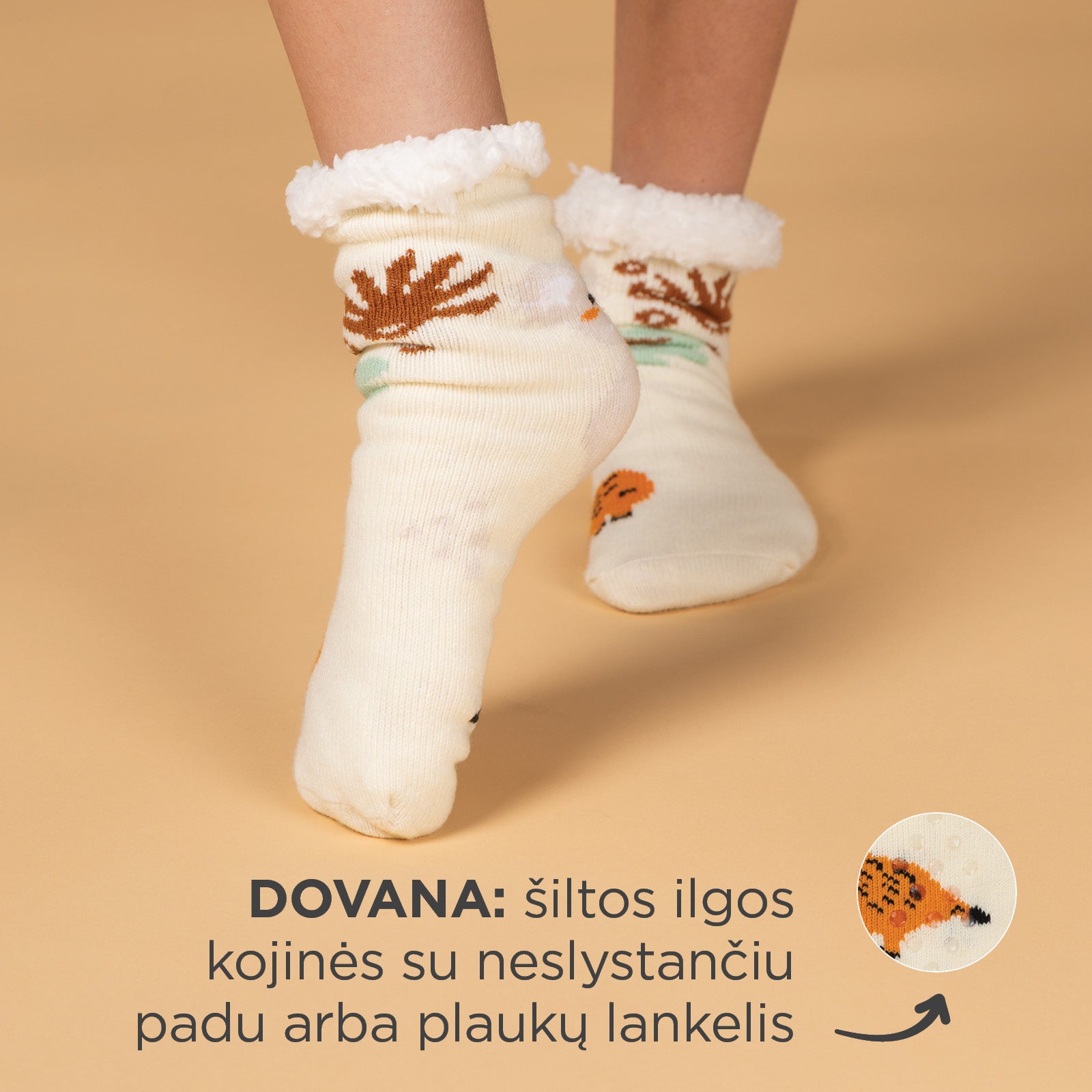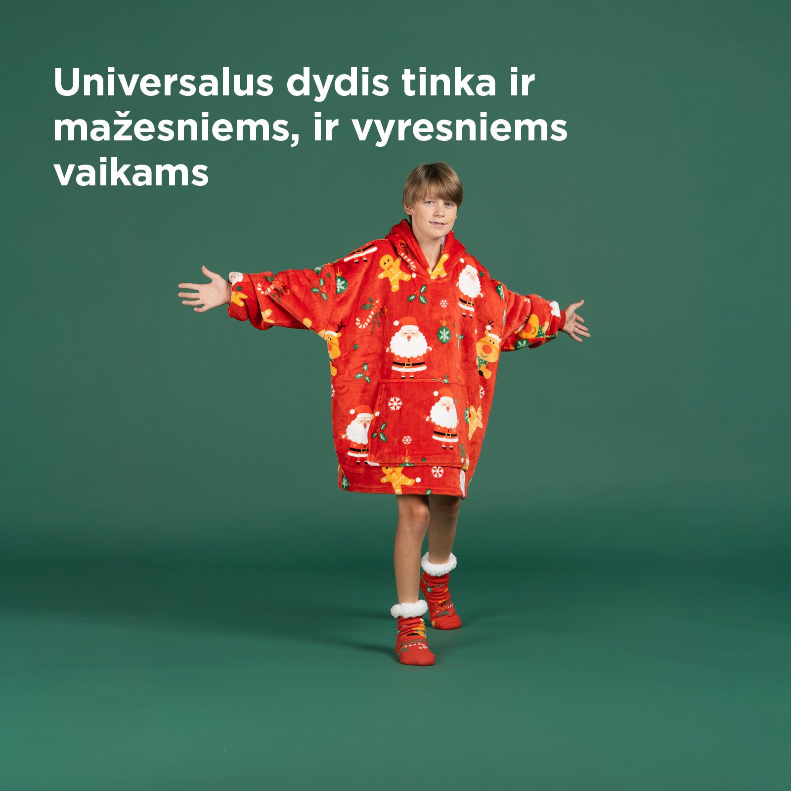 Kiekviena antklodė su gobtuvu turi dovaną, kuri dar labiau pradžiugins vaikus. Šiltos termo kojinės su neslystančiu padu leidžia vaikams saugiai lakstyti po namus, o pėdos išlieka maloniai šiltos. Mergaičių modeliuose vietoje kojinių pridedama plaukų juosta tokiu pačiu raštu kaip ir antklodė su gobtuvu – tobulam stiliaus suderinimui. Praktinė detalė, suteikianti tėvams ramybės, o vaikams – džiaugsmo.