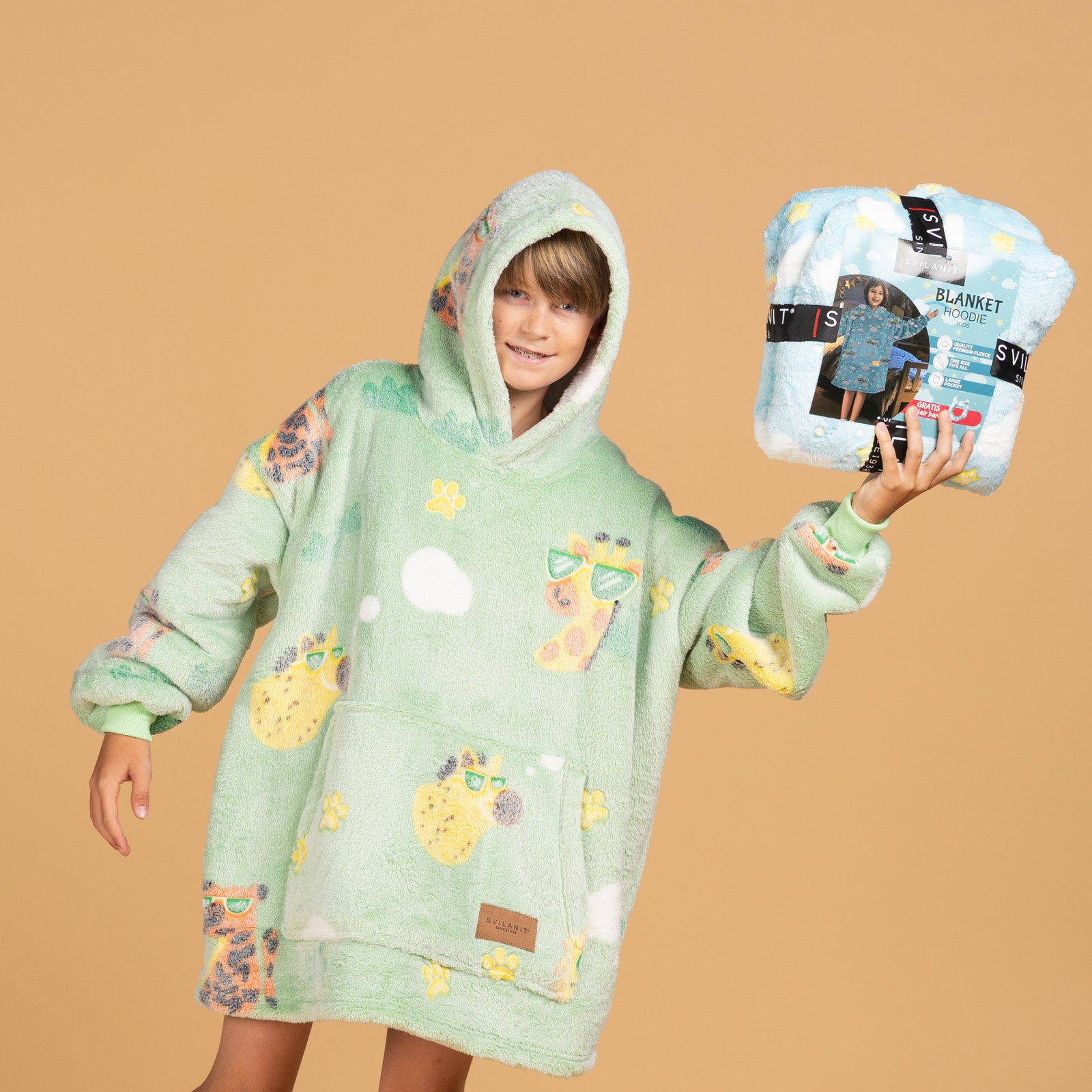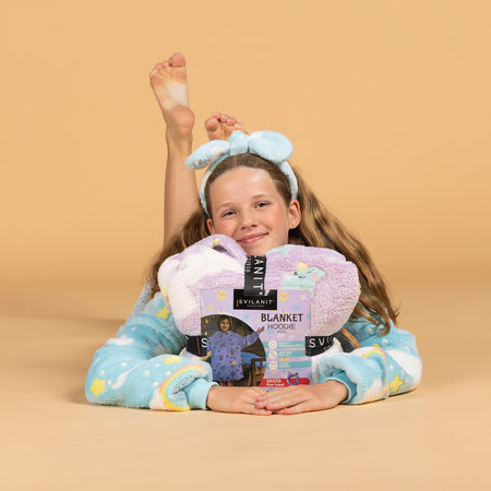 Įsivaizduokite: vaikas guli ant sofos ir žiūri animacinį filmuką, jūs jį gražiai užklojate antklode, kad nesušaltų. Tačiau jau kitą akimirką antklodė numetama, nes vaikams sunku nusėdėti vietoje. Arba vaikas sėdi ant grindų su šaltomis rankomis ir pėdomis, nes antklodė trukdo žaisti. Sprendimas – antklodė su gobtuvu ir rankovėmis Svilanit. Šis minkštas, pūkuotas drabužis pasirūpina, kad vaikams visada būtų šilta – tiek ilsintis, tiek bėgiojant po namus. Dėl gobtuvo ir plačių rankovių antklodė visada išlieka vietoje ir suteikia jausmą, lyg vaikas būtų šiltuose tėvų glėbiuose. Minkštas audinys primena pliušinius žaislus, todėl vaikai mielai vilkės antklodę su gobtuvu, o tėvai jausis ramiai, žinodami, kad jų vaikas nesušals. Papildomą džiaugsmą vaikams suteiks žaismingi raštai, dauguma kurių švyti tamsoje. Megztinis, antklodė ir smagus žaislas viename – geriausia kombinacija laimingiems vaikams ir patenkintiems tėvams.