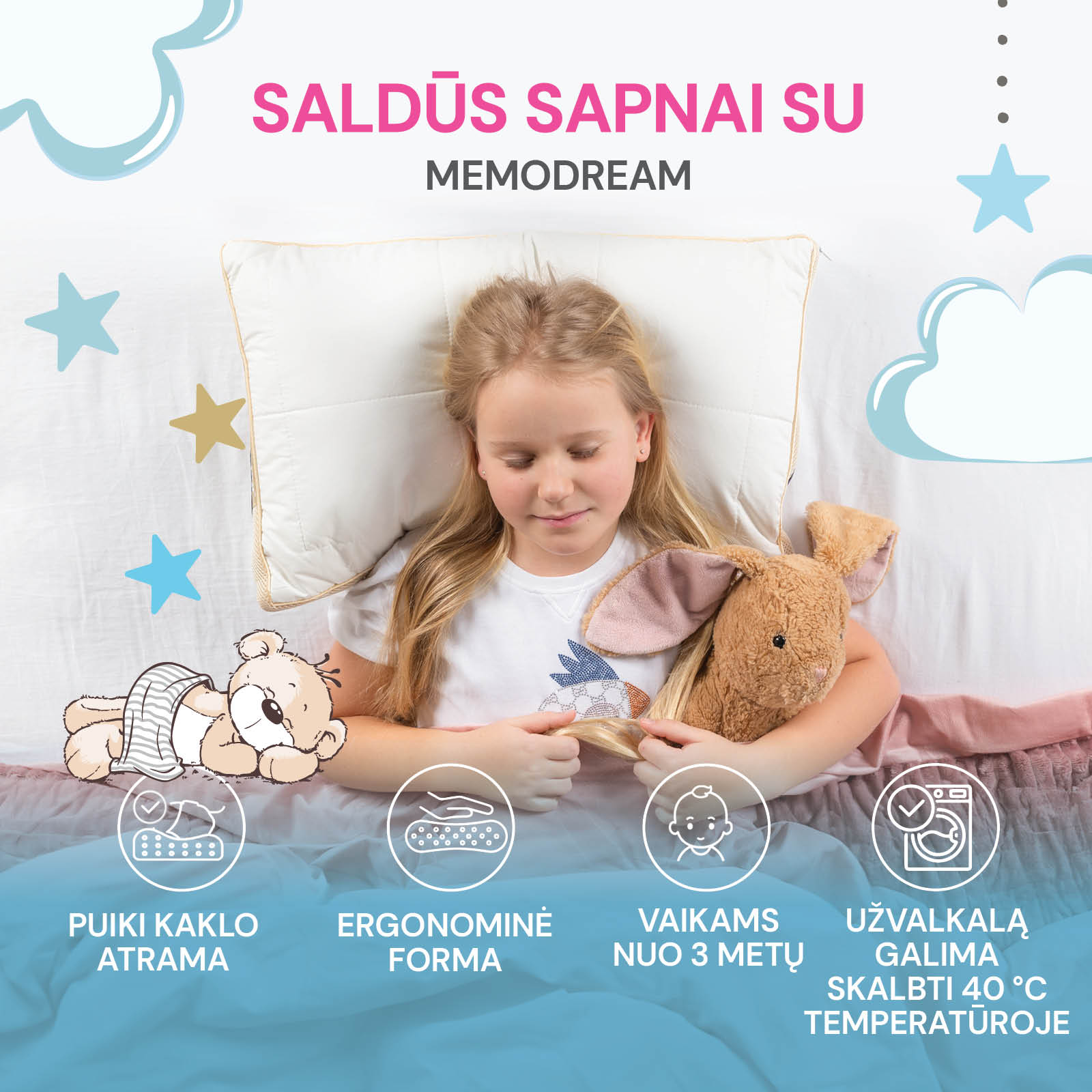 Dėl Memodream Junior pagalvės struktūros vaikai miega ramiau ir rečiau prabunda. Prisitaikantis pluoštas suteikia puikią atramą vaiko kaklo slanksteliams ir galvai visose miego padėtyse. Tinka vaikams nuo 3 metų.
