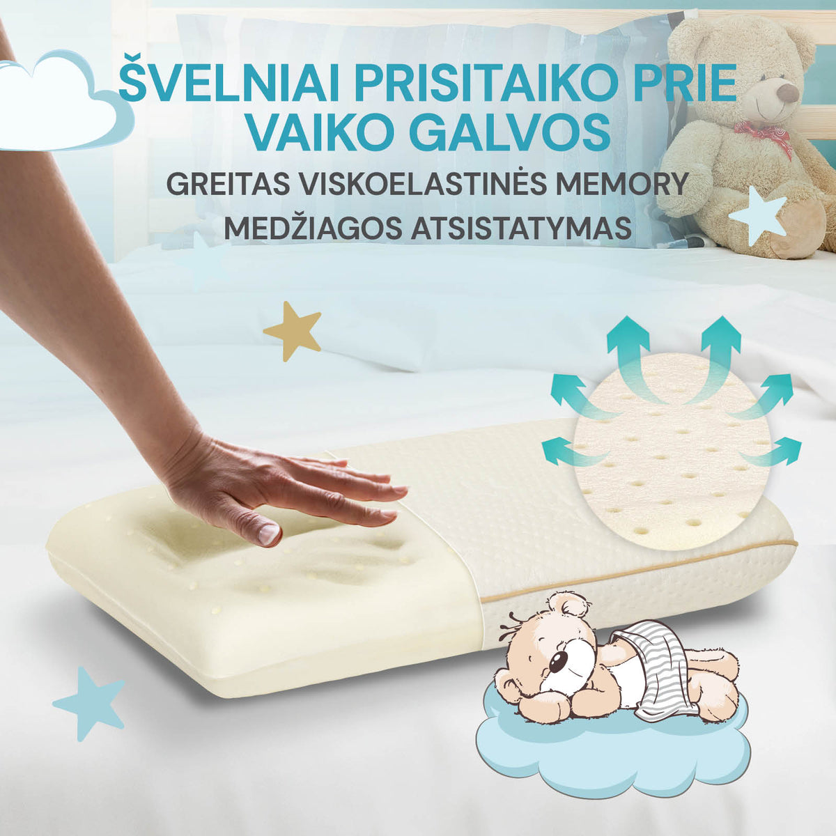- Vaikiška pagalvė puikiai palaiko kūdikio kaklą.