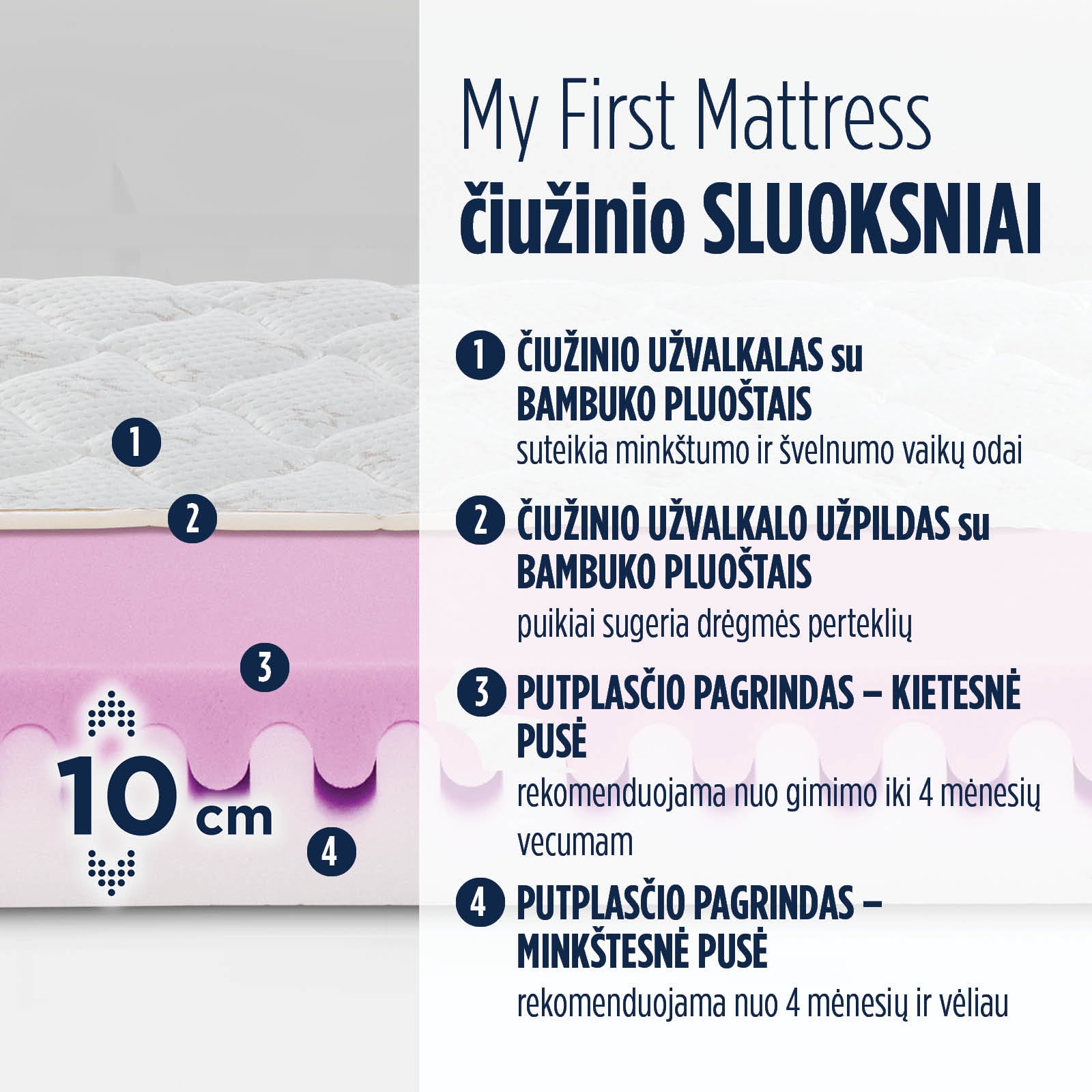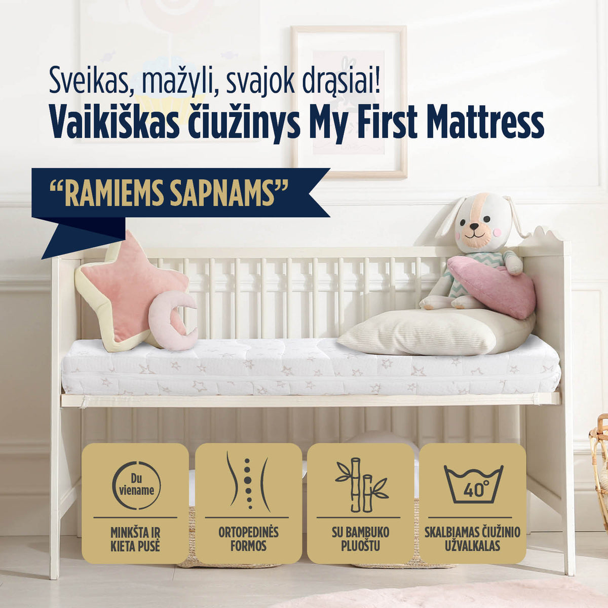 - My First Mattress čiužinys padeda formuoti gerus mažų vaikų miego įpročius nuo ankstyvo amžiaus ir daro įtaką reguliariam miego ciklui net ir vėliau, kai vaikai užauga.