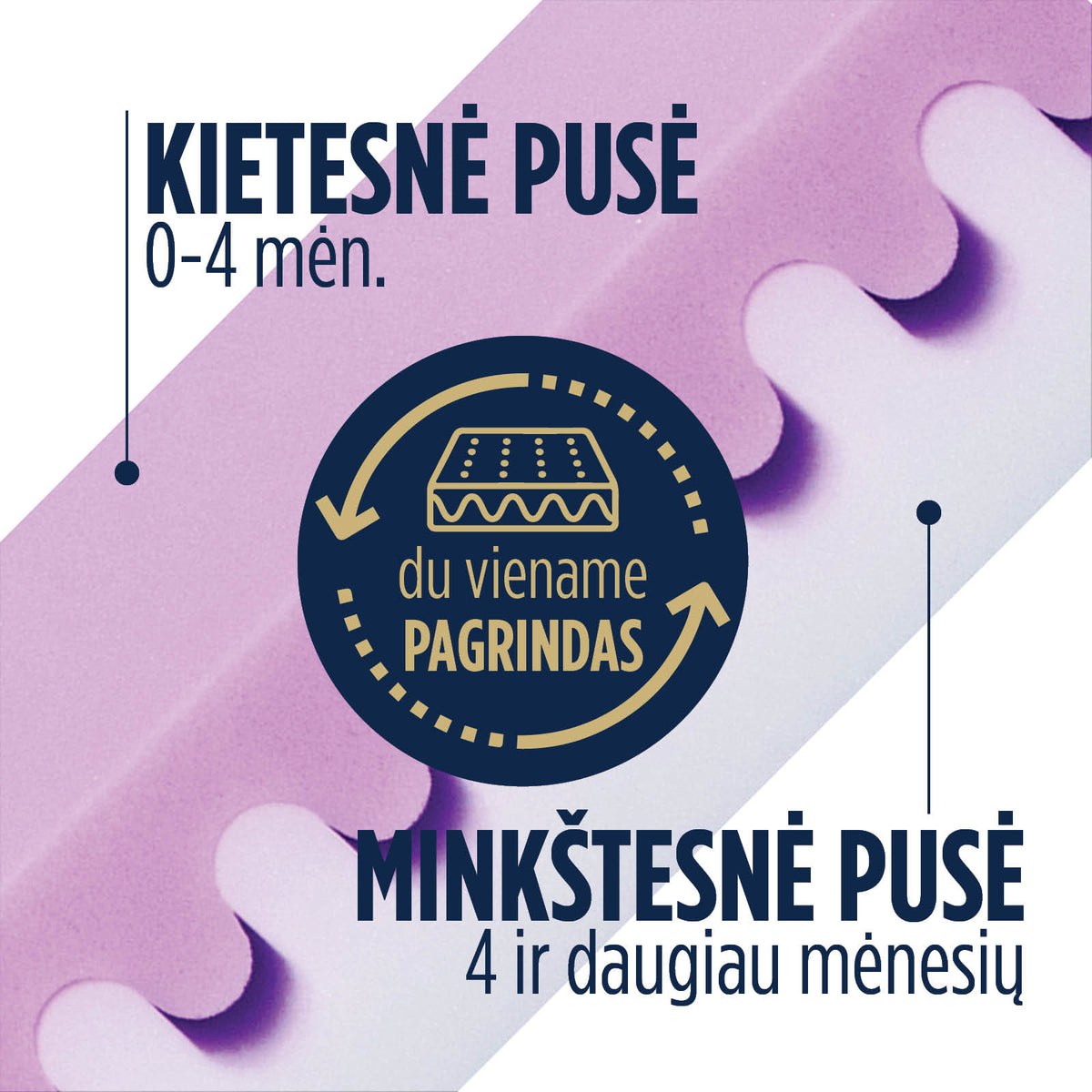 Galima rinktis iš 2 čiužinio kietumo variantų: naujagimiams rekomenduojame miegoti ant kietesnės pusės, o augantiems vaikams – ant minkštesnės.