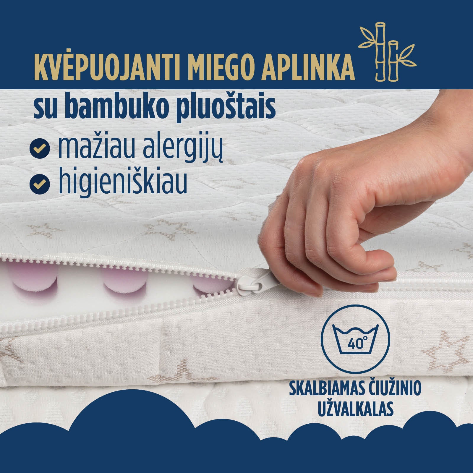 - Su bambuko pluoštu, kad vaikas mažiau prakaituotų naktį ir mažiau prabudinėtų.