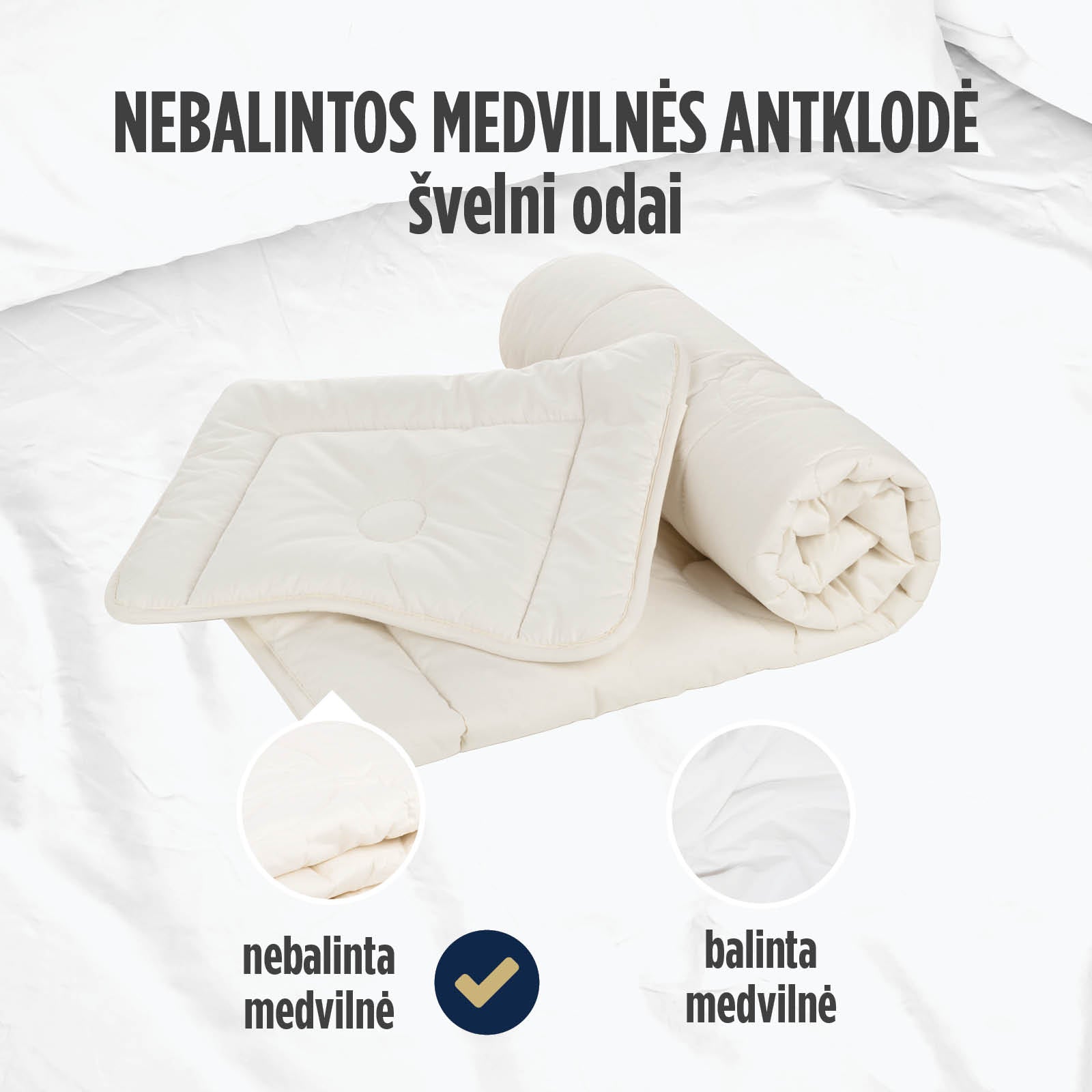 - Užvalkalas pagamintas iš nebalintos medvilnės, kuri yra švelnesnė ir visiškai nekenksminga, palyginti su tradiciniais medvilniniais audiniais.