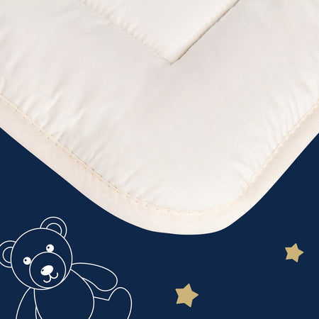 2 dalių My First Duvet & Pillow rinkinys – tai puikus miego rinkinys jūsų kūdikio miegui. Jis tinka vaikams nuo pirmųjų metų. Pagalvė yra žema, minkšta ir dėl savo aukščio puikiai palaiko kūdikio galvą, todėl padeda užtikrinti ramesnį miegą. Minkšta antklodė užtikrina saugią ir šiltą miego aplinką. Nebalintos medvilnės užvalkalas yra švelnesnis ir visiškai nekenksmingas, palyginti su tradiciniu medvilniniu audiniu. Į antklodę taip pat pridėjome bambuko pluošto, kad būtų sukurta sausa miego aplinka, nes jis puikiai sugeria drėgmės perteklių.