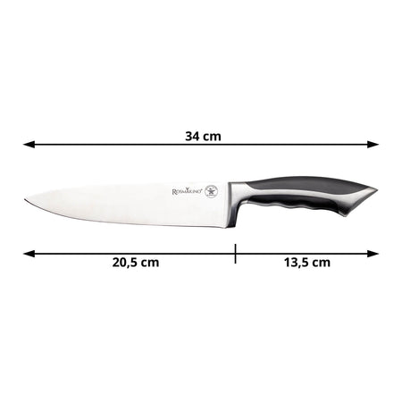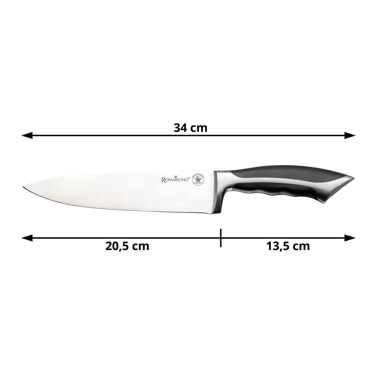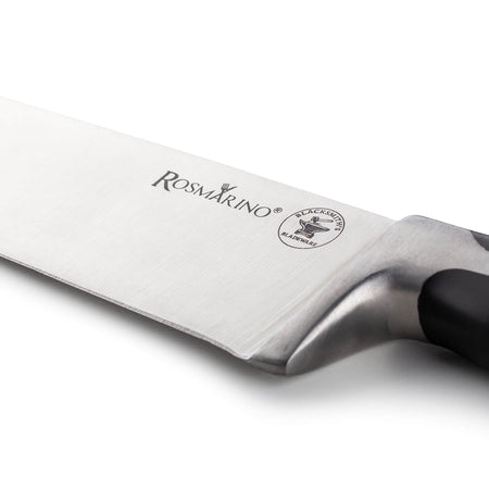 Puikus Rosmarino Blacksmith Chef's peilis kiekvienam profesionaliam ar pradedančiajam virėjui! Didesnis peilis puikiai tinka įvairiems maisto produktams pjaustyti. Peilis pagamintas iš vokiško nerūdijančio plieno, o patvari rankena – iš įpurškiamos formos aukštos kokybės ABS plastiko, leidžiančio išlaikyti maksimalias apkrovas. Ypatingas aštrumas bus puiki pagalba, kai reikia greitai ir tiksliai supjaustyti tiek didelius, tiek mažesnius maisto gabalėlius. Peilio pranašumas – dvipusis rankomis pagaląstas 15° kampu peilis, užtikrinantis ilgalaikį aštrumą ir patvarumą. Peilis yra papildomai atsparus korozijai, rūdims ir dėmėms dėl specialaus šlifavimo proceso. Peilį lengva nuplauti po tekančiu vandeniu su trupučiu ploviklio.