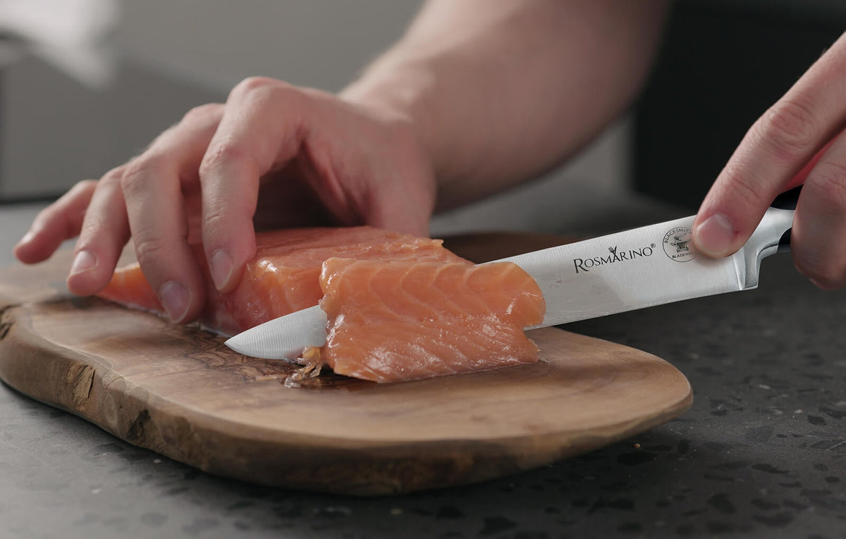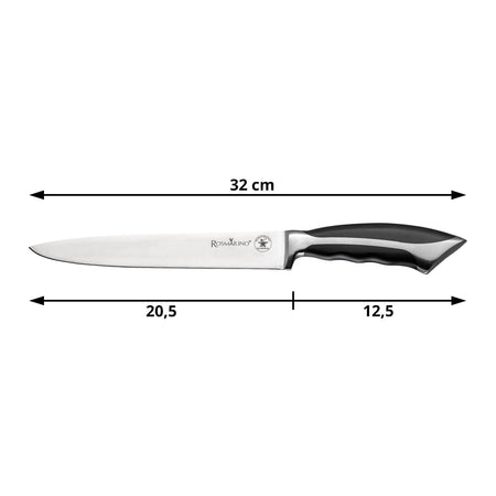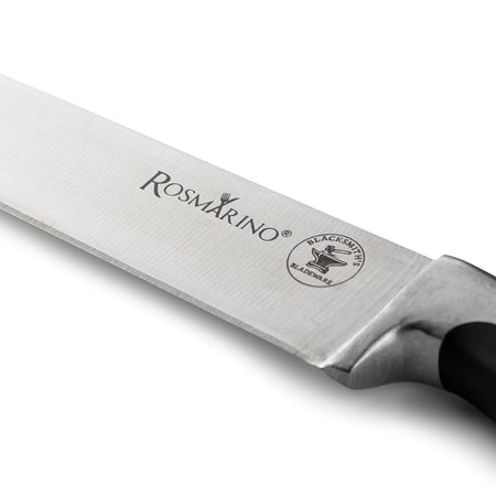Puikus Rosmarino Blacksmith's Slicer peilis kiekvienam profesionaliam ar pradedančiajam virėjui! Didesnis peilis puikiai tinka įvairiems maisto produktams pjaustyti. Peilis pagamintas iš vokiško nerūdijančio plieno, o patvari rankena – iš įpurškiamos formos aukštos kokybės ABS plastiko, leidžiančio išlaikyti maksimalias apkrovas. Ypatingas aštrumas padės, kai reikės greitai ir tiksliai supjaustyti maistą plonesniais griežinėliais, nes jo ašmenų ilgis leidžia pjaustyti greitai ir efektyviai, neįsitempiant. Peilio pranašumas – dvipusis rankomis pagaląstas 15° kampu peilis, užtikrinantis ilgalaikį aštrumą ir patvarumą. Peilis yra papildomai atsparus korozijai, rūdims ir dėmėms dėl specialaus šlifavimo proceso. Peilį lengva nuplauti po tekančiu vandeniu su trupučiu ploviklio.