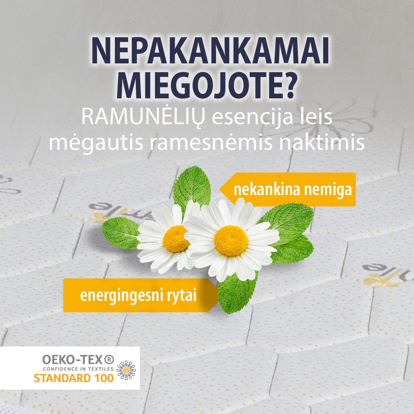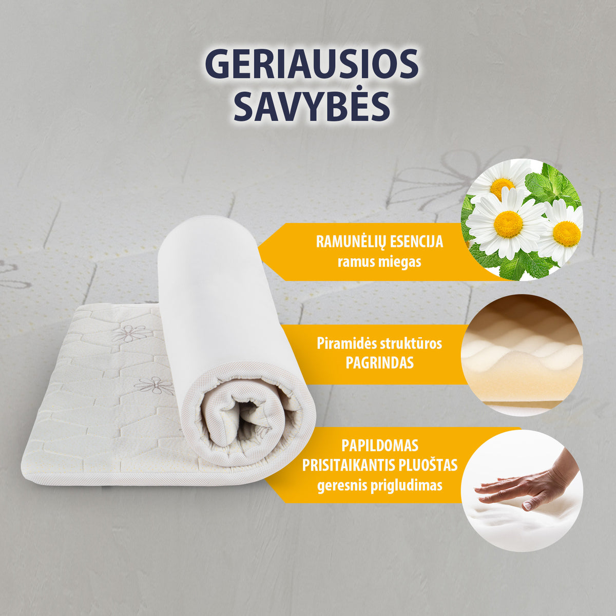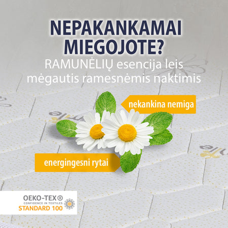 - Atpalaiduojanti ramunėlių esencija dar labiau pagerina miego kokybę, todėl antčiužinis tinka visiems, kenčiantiems nuo nemigos.