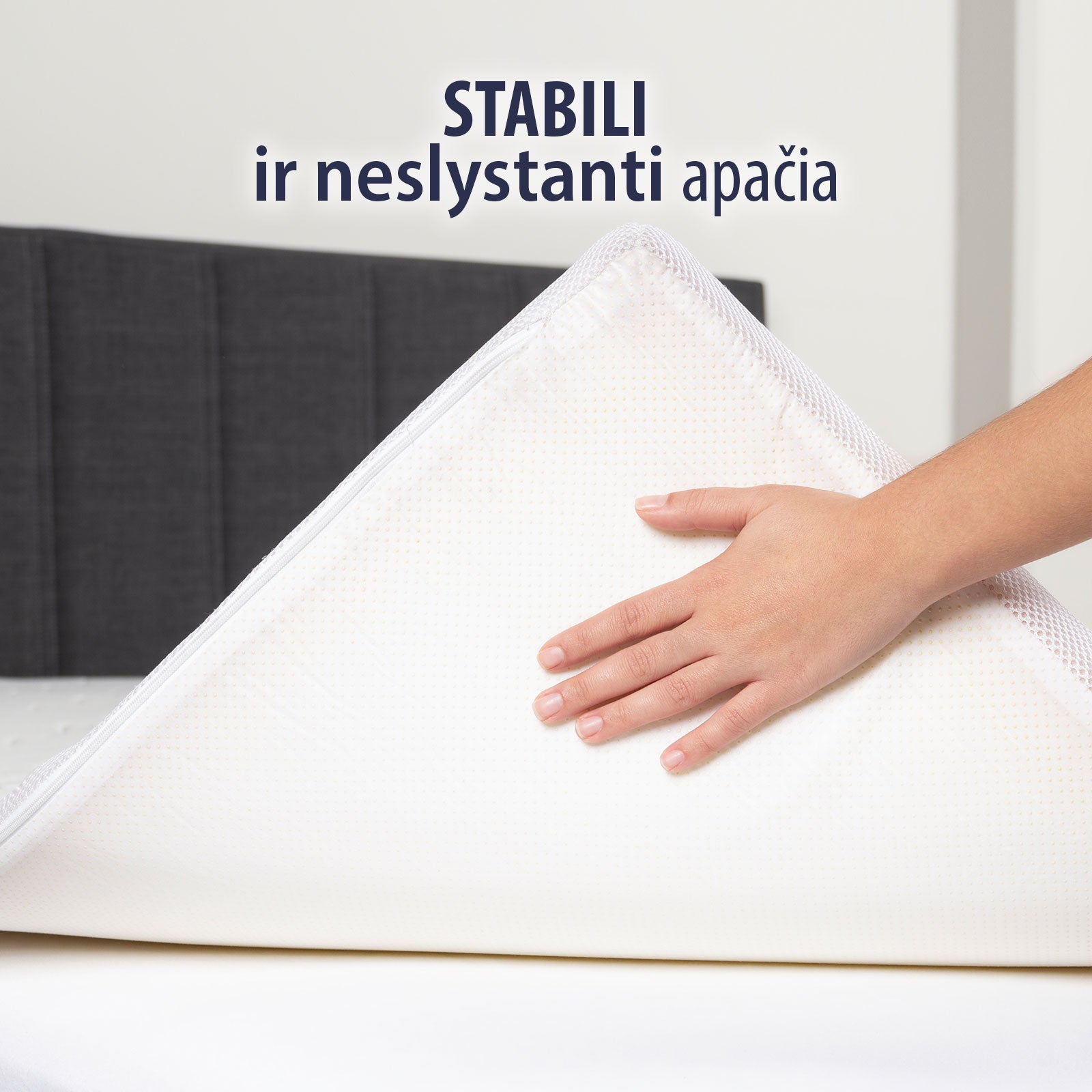 - Neslystantis pagrindas užtikrina, kad antčiužinis nejudėtų ant čiužinio ar kito paviršiaus.