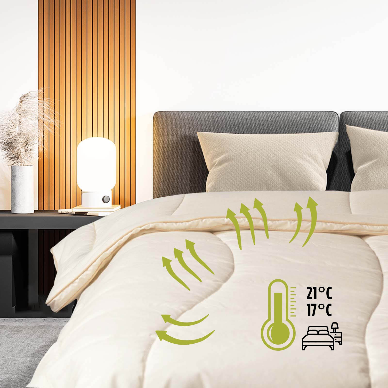 Užvalkale esantys bambuko pluoštai ir nebalinta medvilnė kartu natūraliai pašalina drėgmę, kurią jūsų kūnas išskiria miegant. Tai reiškia, kad miegate po antklode, kuri kvėpuoja kartu su jumis ir visą naktį palaiko idealią temperatūrą. Puikiai tinka miegamiesiems, kurių temperatūra yra nuo 17 iki 21 °C.