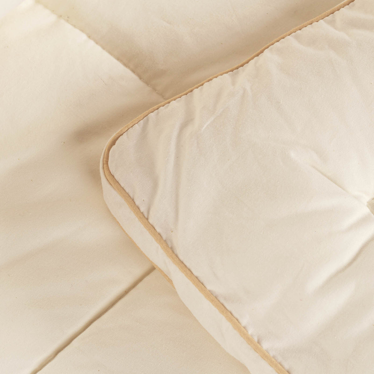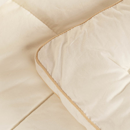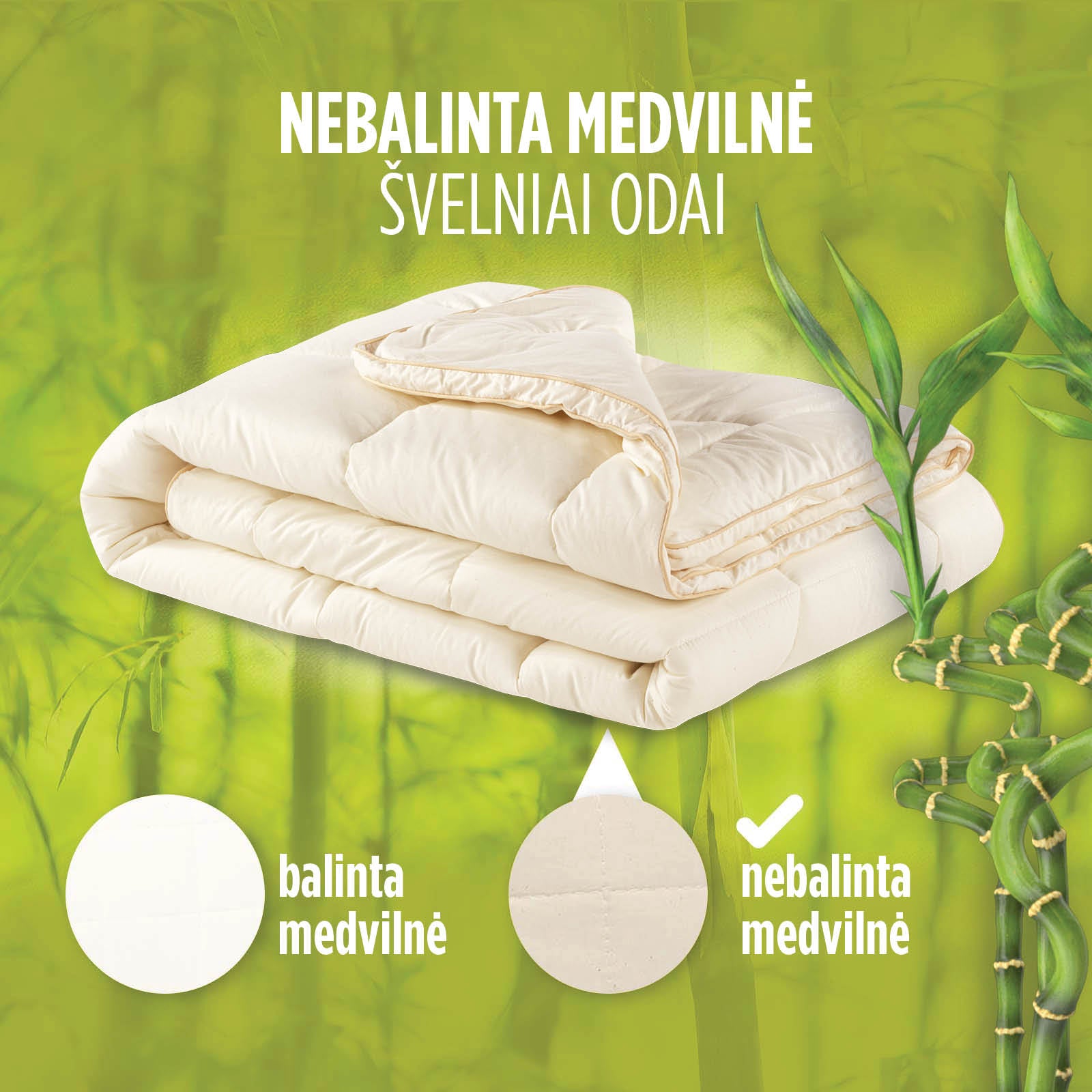 Ši žieminė antklodė pasiūta iš nebalintos medvilnės, kuri yra subtilesnė ir visiškai saugi lyginant su tradiciniais medvilniniais audiniais. Nebalintą medvilnę galite atpažinti iš būdingų juodų taškelių – tai yra natūrali išvaizda.