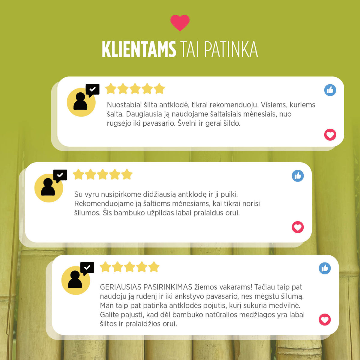 Šilta sodrios apimties antklodė, kuri puikiai reguliuoja kūno temperatūrą. Bambuko pluošto ir minkšto mikropluošto derinys įdaroje apsaugo jus nuo šaltesnių rudens ir žiemos temperatūrų. Bambuko antklodė taip pat puikiai tiks tiems, kurie dažnai šalta ištisus metus ir mėgstate naktį prisidengti šiltesniais audiniais.